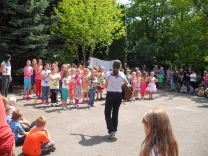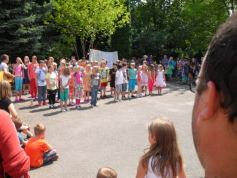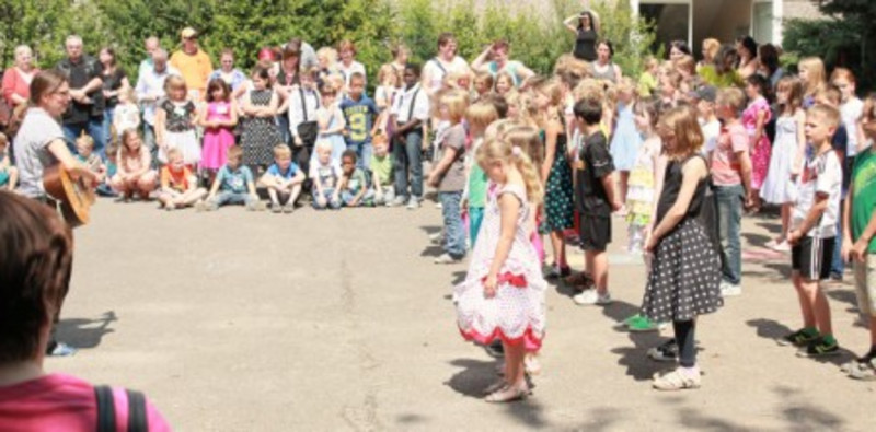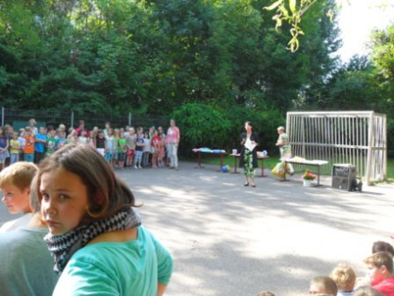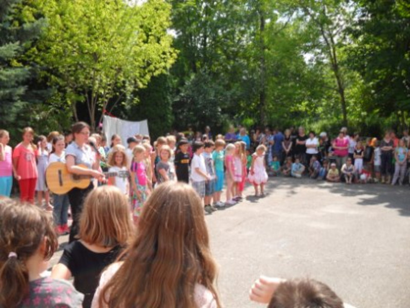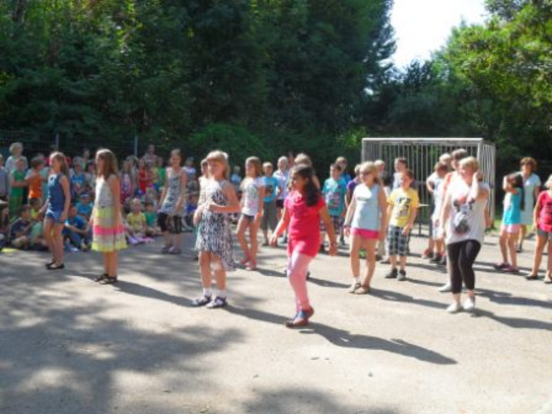 Im Anschluss an die Siegerehrung für die erfolgreichen Teilnehmer an unseren Sportwettkämpfen verabschiedeten sich die 4. Klassen mit Liedern, Tänzen und einer lustigen Modenschau.