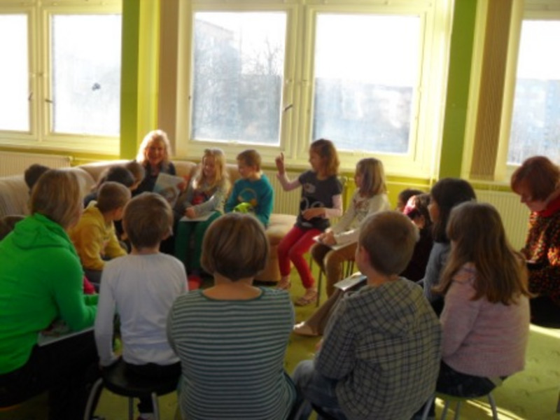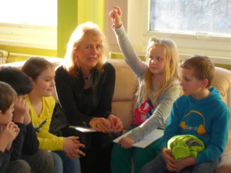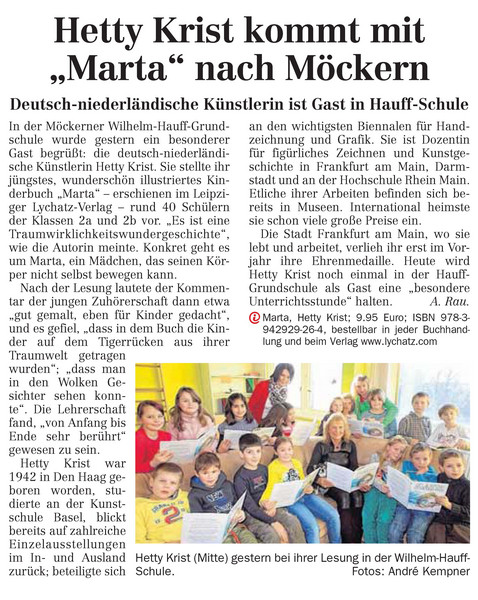 Am Montag, dem 10.2. und Dienstag, dem 11.2.2014 durften wir an unserer Schule einen besonderen Gast begrüßen. Die deutsch-niederländische Künstlerin Hetty Krist besuchte Schüler unserer Schule und stellte ihnen ihr neues und ansprechend illustriertes Kinderbuch "Marta" vor. Dieses Buch erschien im Lychatz-Verlag und ist nach Aussage der Autorin eine "Traumwirklichkeitswundergeschichte". Mit ihrer Geschichtete begeisterte und berührte Hetty Krist sowohl Schüler als auch deren Lehrer.