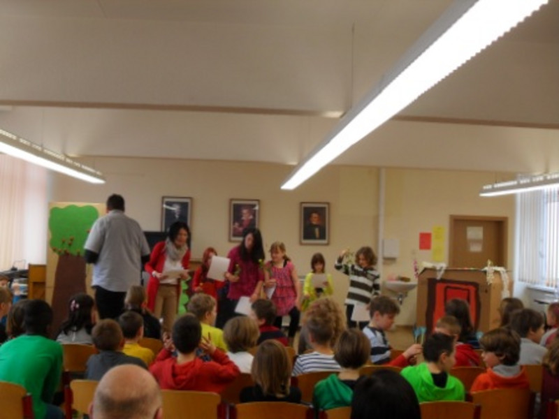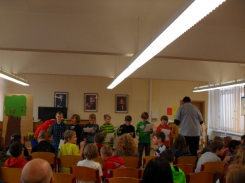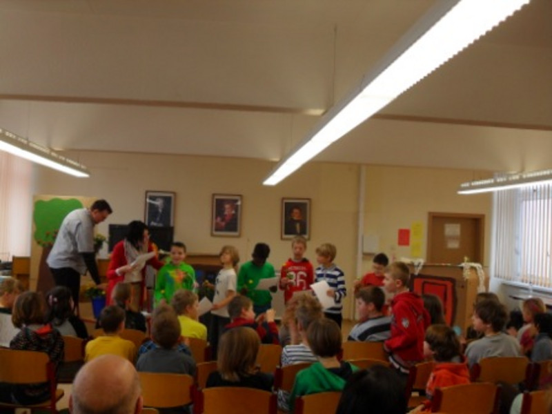 Einige Kinder der Klassen 4a und 4b gestalteten mit ihrem Theaterstück einen würdigen Rahmen der Feierstunde. Entstanden war das Theaterstück "Frau Holle" im Rahmen des Ganztagsangebotes "Programme durch das Jahr" unter Leitung von Frau Bunte. Gespannt und aufmerksam folgten ihre Mitschüler und anwesende Eltern dem kleinen Spiel.