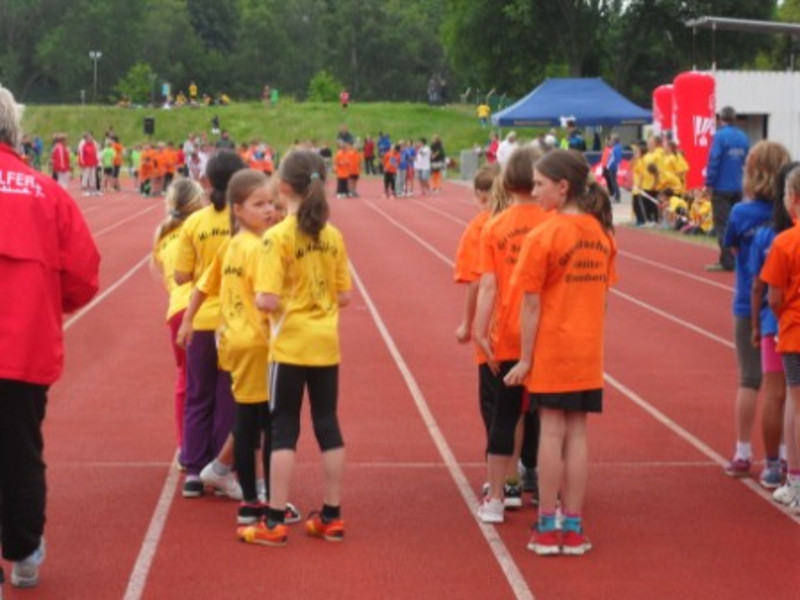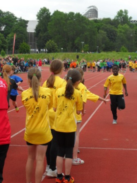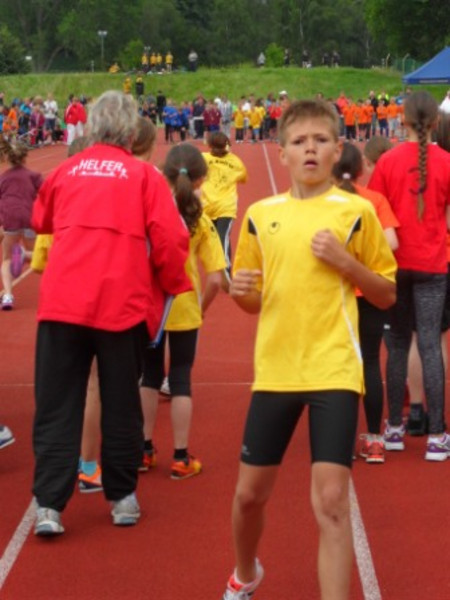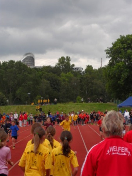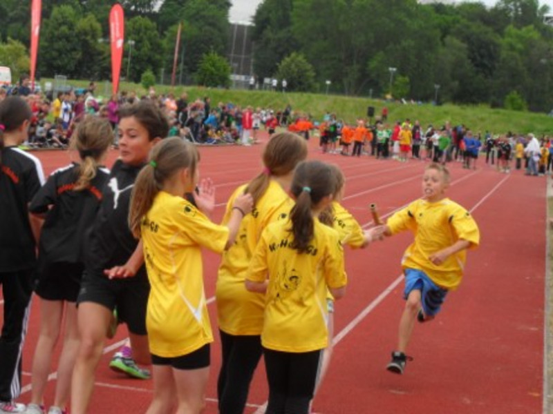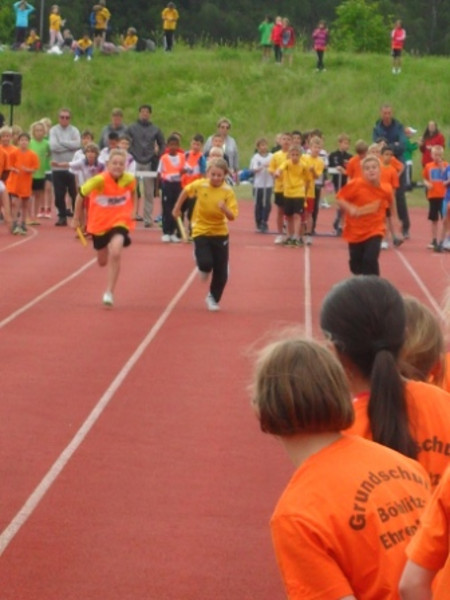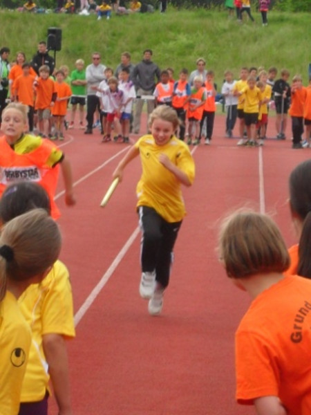 In den Vorläufen traten die einzelnen Mannschaften jeder Klassenstufe gegeneinander an und die ersten 2 oder 3 jedes Vorlaufes qualifizierten sich für das Finale. Riesengroß war die Freude, als sich unsere Läuferinnen und Läufer der 1. Klasse als Vorlaufdritte und die Kinder der 2. Klasse als Vorlaufzweite für den Endlauf qualifizieren konnten. Obwohl auch die Kinder der Klassenstufe 3 ihr Bestes gaben, gelang ihnen dieser Sprung nicht. Sie erreichten in ihrem Lauf Rang 5 und zeigten alle eine tolle Leistung. Hoffnung, Spannung und Bangen dann im Vorlauf der 4. Klasse. Nachdem ein Läufer den Stab verloren hatte, jedoch blitzschnell reagierte und superschnell lief, konnten die verbleibenden Kinder mit tollem Einsatz und Kampfgeist und vor allem Michelle mit einem irren Endspurt den 3. Platz im Vorlauf und damit die Finalteilnahme sichern.