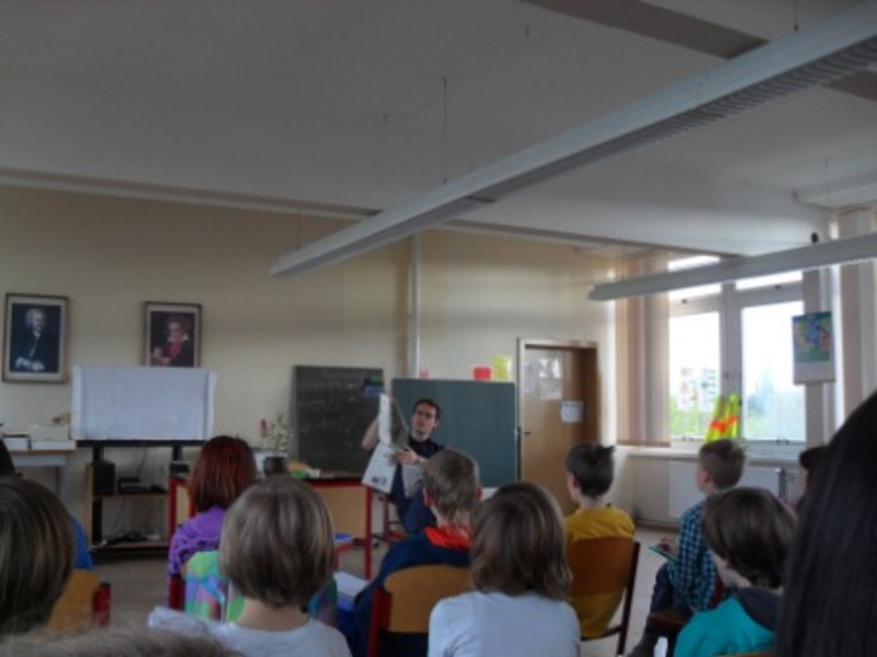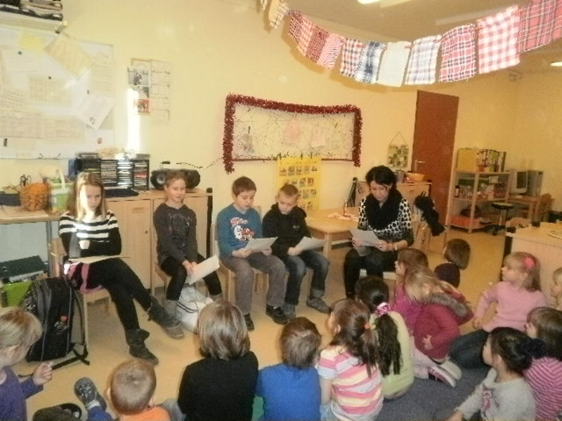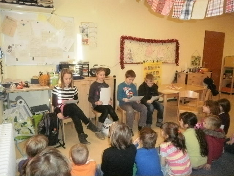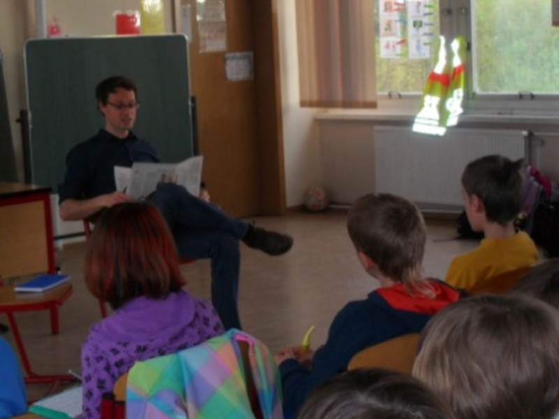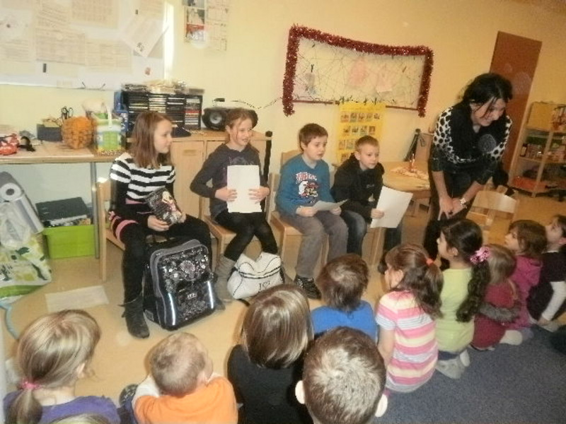 Einige Schüler der Klassen 3a und 4b besuchten unsere zukünftigen Schüler im Rahmen der Lesetage in ihren Kindergärten und lasen "Die Geschichte von Caroline, die nicht zur Schule gehen wollte". Sie trafen dort auf aufmerksame und wissbegierige Zuhörer, die sich auch sehr für den Inhalt eines Schulranzens und einer Sporttasche interessierten.