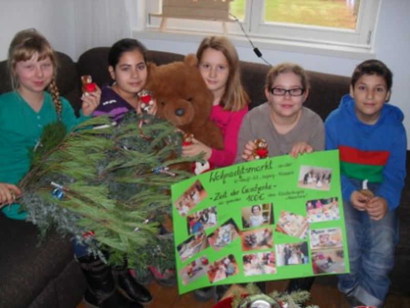 Wir wollten einen Teil des Erlöses unseres Weihnachtsmarkes dem "Kinderhospiz Bärenherz" spenden. Dafür fuhr unsere Rektorin Frau Theil-Schulze mit 5 Schülern der Klasse 4b am Mittwoch, dem 18.12.2013 zum Hospiz. Mit im Gepäck waren Bilder und Briefe unserer Schüler, selbstgebackene Muffins, ein Spendenplakat mit Bildern von unserem Weihnachtsmarkt sowie ein Geldgeschenk-Strauß im Wert von 100,-€.