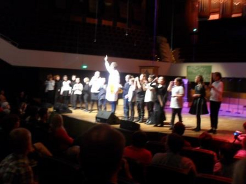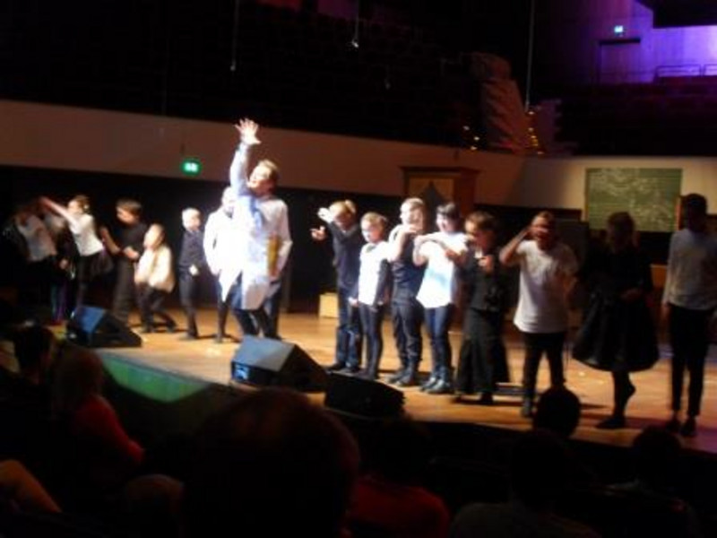 Nach Proben in der Schule und auch im Gewandhaus standen die Schülerinnen und Schüler der Klasse 4b vor gut gefüllten Zuschauerrängen am Samstag endlich auf der Bühne im großen Saal des Gewandhauses.