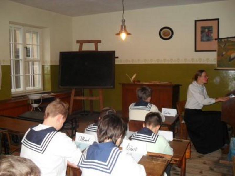 Dieser Ausflug wurde zu einer interessanten Zeitreise in die Schule vor 100 Jahren. Die Kinder durften erleben, wie die Schüler damals unterrichtet wurden. Ausgestattet mit Schürze, Schleife oder Matrosenhemd sowie Namen wie Trude, Auguste oder Gustav erarbeitete die gestrenge Fräulein Lehrerin ein Lied, kleine Verse, einige Buchstaben in alter deutscher Schrift sowie Turnübungen mit ihren wohlerzogenen Schülern. Wer sich nicht so fleißig und strebsam präsentierte, musste zur Strafe in der Ecke stehen. Zu unserem großen Glück kamen Eselsmütze und Eselsbank nur Demonstrationszwecken zum Einsatz.