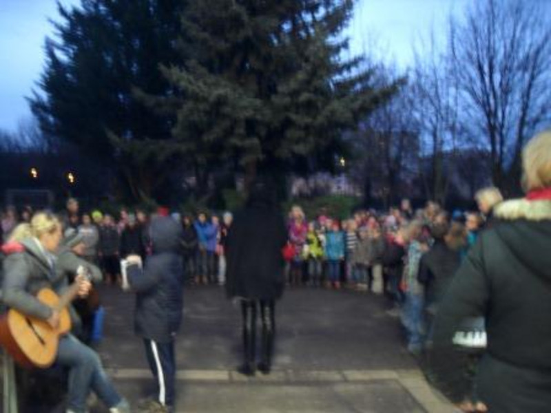 Am letzten Schultag des Jahres 2014 trafen sich die Schülerinnen und Schüler sowie alle Lehrer unserer Schule gleich zu Schulbeginn um 7.45 Uhr auf dem Schulhof zu einem gemeinsamen Weihnachtsliedersingen. Alle Kinder waren auf Lieder wie "Kling Glöckchen" oder "Alle Jahre wieder" vorbereitet und sangen gemeinsam mit instrumentaler Begleitung durch Frau Rutte, Frau Rahnfeld und Frau Jannaschk. In der Morgendämmerung verbreitete sich eine wunderbare, weihnachtliche Stimmung, welche die Kinder ganz sicher mit in ihre Klassenzimmer nahmen um den letzten Tag vor den Weihnachtsferien dort im Klassenverband zu gestalten.