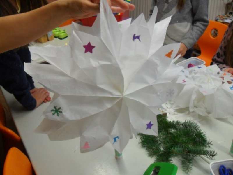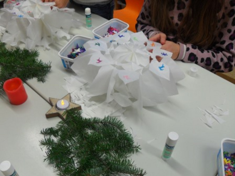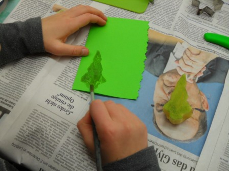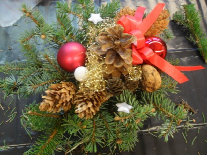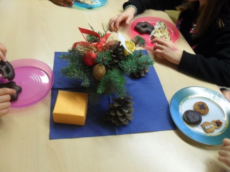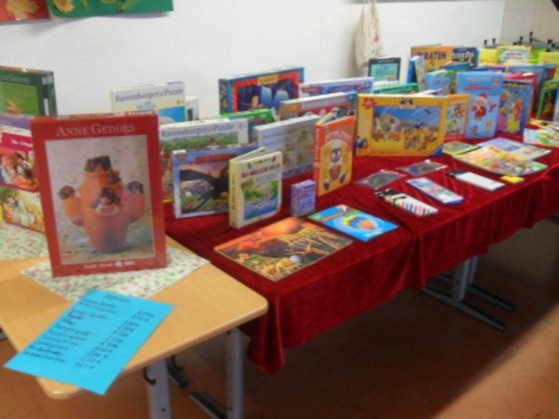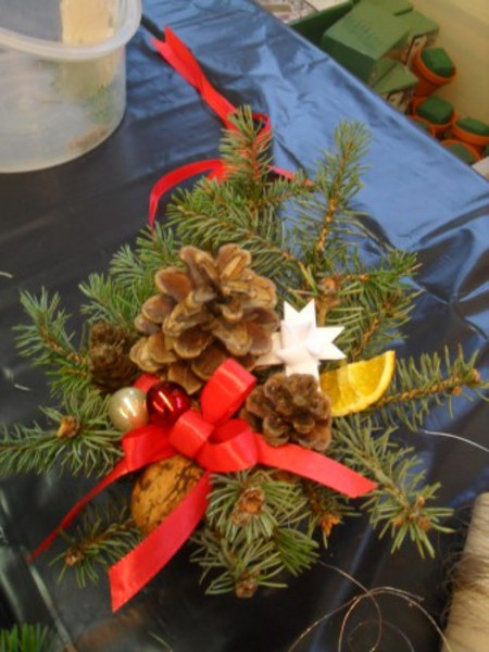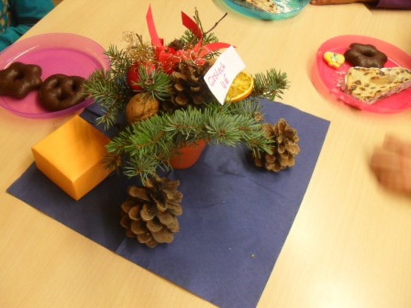 Bei Bratwurst, Glühwein und Kinderpunsch oder im Café konnte man sich stärken. Auf dem vom Kinderrat und Frau Kruse organisierten Flohmarkt gab es für kleines Geld das eine oder andere Geschenk zu kaufen. Mit Geduld und Geschick konnte man jedoch auch an vielen verschiedenen Stellen kleine Kostbarkeiten selbst herstellen. Ob Gestecke, Holzhäuschen, Weihnachssterne aus Butterbrotpapier, Baumschmuck aus Salzteig, Schneekugeln etc. konnten auch Weihnachtsgrußkarten mit Kartoffeldruck gestaltet werden.