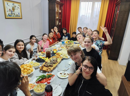 Nach unserer Ankunft wurden wir sehr herzlich von unseren kasachischen Austauschpartnerinnen und -partnern sowie deren Familien empfangen mit Süßigkeiten Gebäck und viel Freude. Schon in den ersten Stunden konnten wir einen Eindruck vom Alltag in Kasachstan gewinnen. Die Gastfamilien begegneten uns mit großer Offenheit und Gastfreundschaft. Obwohl es anfangs kleine sprachliche Schwierigkeiten gab, fühlten wir uns schnell willkommen und gut aufgenommen. Ein besonderer Teil des Austauschs war der Besuch unserer Partnerschule. An mehreren Tagen nahmen wir am Unterricht teil und lernten das kasachische Schulsystem kennen. Besonders interessant war es, die Unterschiede und Gemeinsamkeiten zu unserem eigenen Schulalltag zu vergleichen. Der Unterricht war oft sehr strukturiert, und wir stellten fest, dass Bildung in Kasachstan einen hohen Stellenwert hat. In gemeinsamen Projekten und Gruppenarbeiten konnten wir uns aktiv einbringen und mit den kasachischen Schülerinnen und Schülern austauschen. Neben dem Schulbesuch standen zahlreiche spannende Programmpunkte auf dem Plan. Wir besuchten verschiedene Sehenswürdigkeiten und Museen, die uns einen tiefen Einblick in die Geschichte und Traditionen Kasachstans gaben. Besonders beeindruckend war der Besuch des Nationalmuseums, wo wir viel über die Entwicklung des Landes und seine kulturelle Vielfalt erfahren haben. Ein weiteres Highlight war das Kennenlernen der kasachischen Küche. In den Gastfamilien sowie bei gemeinsamen Essen probierten wir traditionelle Gerichte wie Beshbarmak, Plow oder Baursaki. Für viele von uns waren die Speisen ungewohnt, aber sehr lecker. Auch hierbei konnten wir viel über die Kultur und die Bedeutung von gemeinsamen Mahlzeiten lernen. In unserer Freizeit verbrachten wir viel Zeit mit unseren Austauschpartnerinnen und -partnern. Gemeinsam gingen wir spazieren, besuchten Einkaufszentren, spielten Spiele oder unterhielten uns über Schule oder auch Hobbys. Dabei fiel auf, dass es nicht nur Unterschiede, sondern auch viele Gemeinsamkeiten gab. Dabei konnten wir außerdem unsere Sprachkenntnisse verbessern. Die zehn Tage vergingen leider zu schnell. Am letzten Tag fiel uns der Abschied deshalb besonders schwer, da wir in dieser kurzen Zeit viele schöne Erinnerungen gesammelt und enge Freundschaften geschlossen hatten. Aber zum Glück war unser Abenteuer dort noch nicht vorbei da uns ja noch ein Gegenbesuch erwartete.