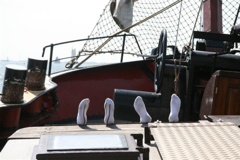 Während der Einfahrt in die Schleuse zurück zum Ijsselmeer war ein kleiner Segler sehr unvorsichtig und wollte sich vor unsere beiden Schiffe drängeln. Seinen Wagemut musste er mit einem gebrochenen Mast bezahlen. Glücklicherweise war nichts Schlimmeres passiert. Der Unfall bedeutete allerdings Zeitverlust wegen der polizeilichen Unfallaufnahme. Den nutzten wir zu einem ausgiebigen Bad im Ijsselmeer.