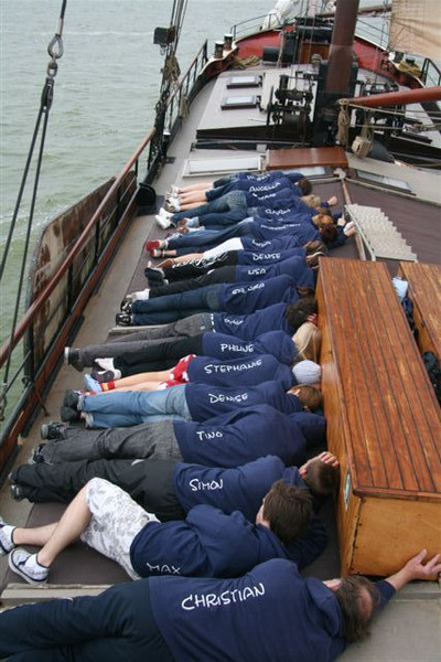 Alle lernten recht schnell, was uns unsere Skipper mit einem Gemisch aus deutsch und holländisch sagen wollten. Hauptsegel, Besan, Fock hoch, Klüverbaum runter, klar zur Wende ... - Nach kurzer Zeit alles kein Problem mehr für uns.