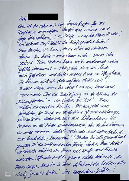 Im Dezember 2020 nahmen 75 SchülerInnen aller Klassenstufen an der Aktion „Ein Lächeln per Post“ teil, indem sie weihnachtliche Briefe an SeniorInnen in Alten- und Pflegeheimen schrieben. Diese wurden durch den Bildungsfunken e.V. an verschiedene Einrichtungen in und um Dresden geschickt.