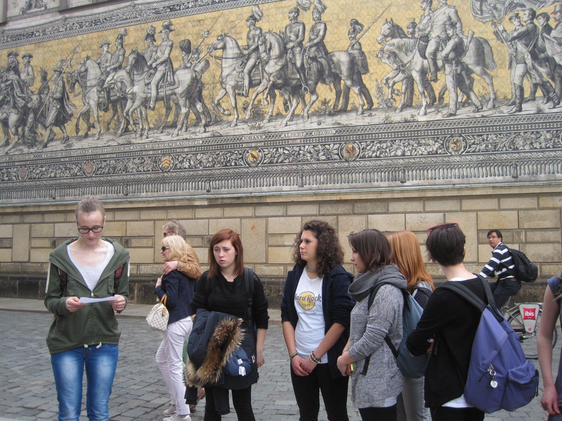 Auch in diesem Jahr stand für die Schüler des Italienischkurses Klasse 10 der Schüleraustausch mit unserem Partnergymnasium, dem Liceo Linguistico di Trento, auf dem Jahresplan. Leider fanden sich in dem kleinen aber feinen Kurs nicht genug Interessenten für eine Reise nach Italien. Da sich unsere Partner nun aber schon auf die Fahrt nach Elbflorenz freuten, wurde die Entscheidung getroffen, wenigstens die Gäste hier in Dresden zu empfangen, wenn auch kein Gegenbesuch stattfinden sollte. Und so trafen am 5.4. sechzehn Schülerinnen und Schüler der 3b (Klasse 11) mit ihren Lehrerinnen und jede Menge Gepäck am Dresdner Hauptbahnhof ein. In der folgenden Woche brachte jeder Tag seine eigenen Höhepunkte: wir sahen das Stück „Così fan tutte“ in der Semperoper, wir ließen uns von den Schülerinnen des Italienischkurses 10 durch die Altstadt führen, wir bekamen eine wunderbare Stadtführung in Meißen, wir schipperten bei Kaiserwetter auf der Elbe nach Königstein. Zudem besichtigten die Italiener gemeinsam mit ihren Lehrerinnen Signora Goio und Signora Elestei das Grüne Gewölbe und die Galerie Alte Meister. In dieser Woche wurde wohl nicht nur den Gästen, sondern auch uns Dresdnern einmal mehr bewusst, in welch schöner Stadt wir doch wohnen. Außerdem wurden neue Freundschaften geschlossen, die Dank Facebook und co hoffentlich noch lange Bestand haben werden. Ein herzliches Dankeschön noch einmal allen Gastfamilien - grazie mille!