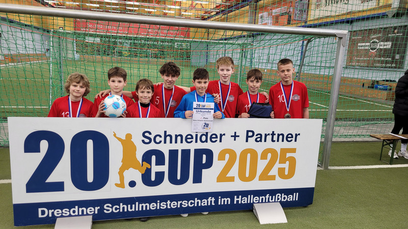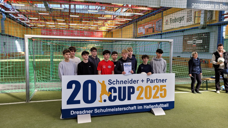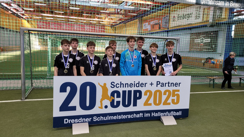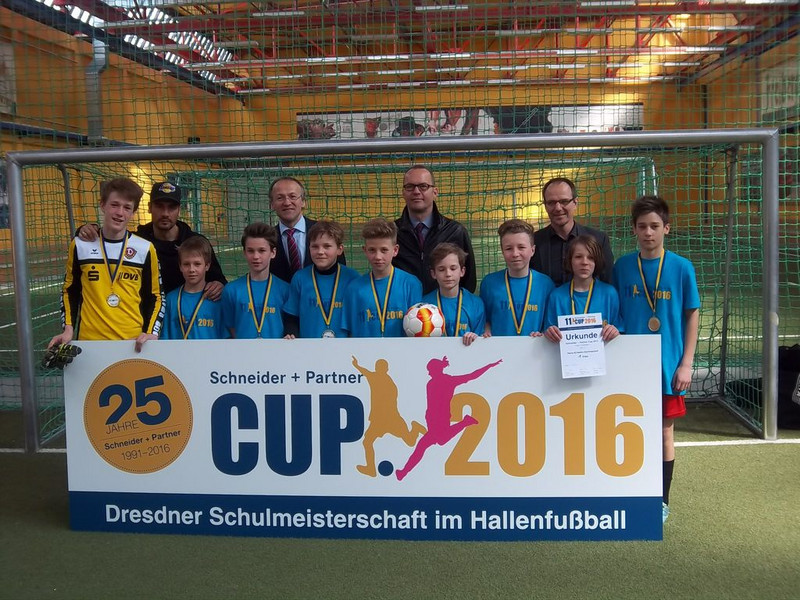 Unsere Jungs der Wettkampfklasse III haben im diesjährigen Schneider und Partner Cup Hallenfußballturnier mit einem zweiten Platz in der Vorrunde die Finalspiele erreicht. Hier trafen sie am 03.04.2014 auf die besten Teams der Dresdener Gymnasien. Mit großem Kampf und Einsatz erkämpften sie die Silbermedaille. Herzlichen Glückwunsch.