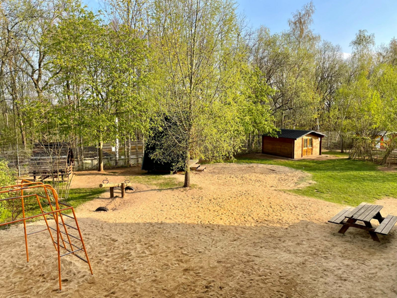 Auf unserem großzügigem Außengelände befinden sich ein Volleyball- und Tischtennisplatz, verschiedene Spielflächen, ein Weideniglu, eine Bewegungsbaustelle und ein Fußballfeld.