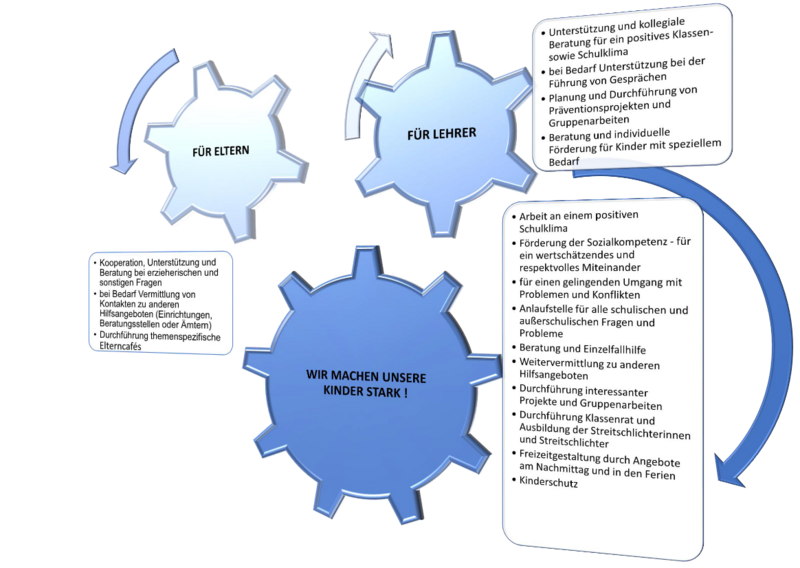 Die Schulsozialarbeit richtet sich vor allem an die Schülerinnen und Schüler der Grundschule sowie deren Eltern und Erziehungsberechtigte, daneben natürlich auch an die Lehrkräfte und das sonstige Schulpersonal. Sie versteht sich als eine Schnittstelle sowie Brücke zwischen Jugendhilfe – Kindern – Eltern und Lehrkräften.