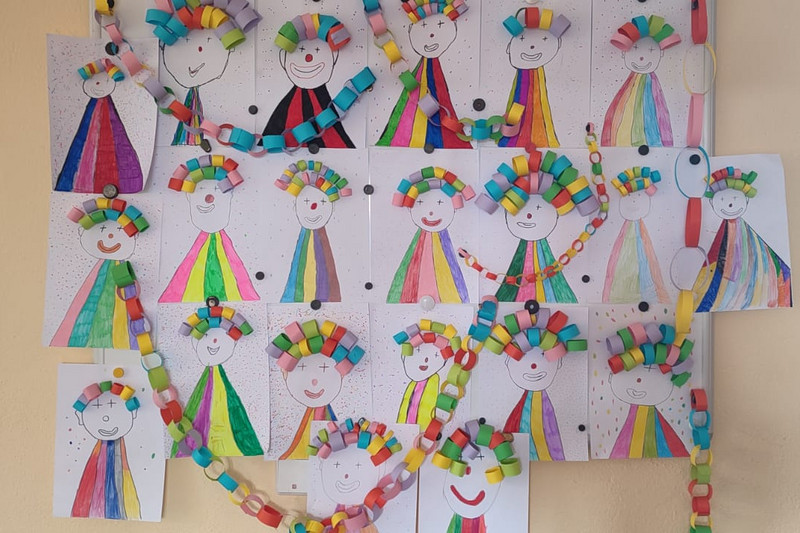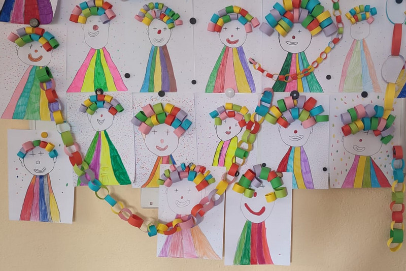Die Klasse 2a begrüßte die 5. Jahreszeit mit herrlich bunten Clownsgesichtern, die sie im Kunstunterricht gestaltet haben. Da ist Schmunzeln vorprogrammiert.