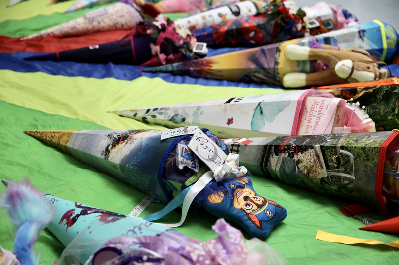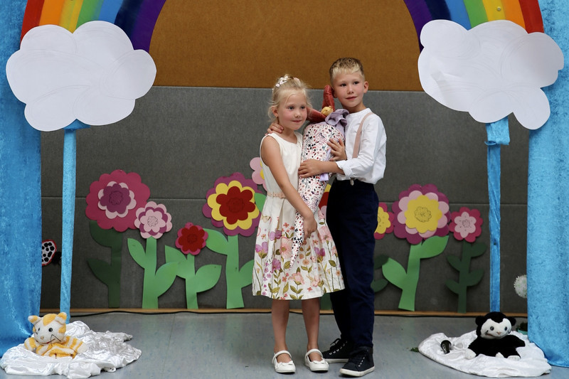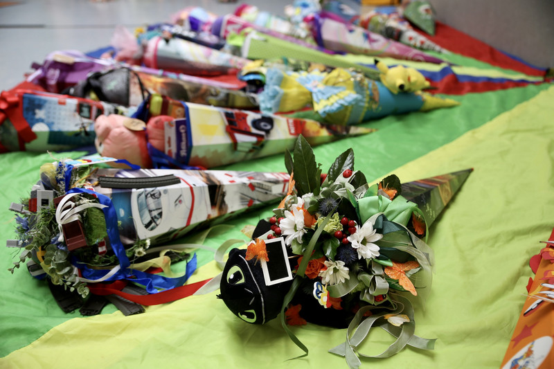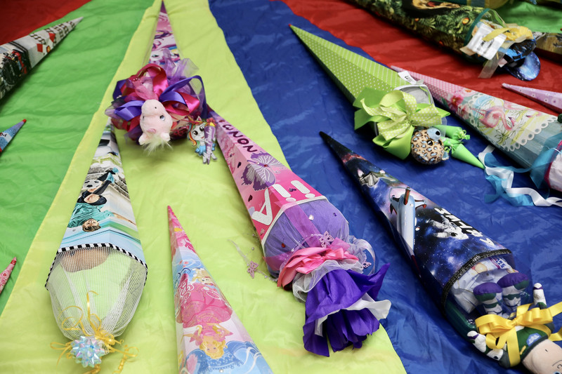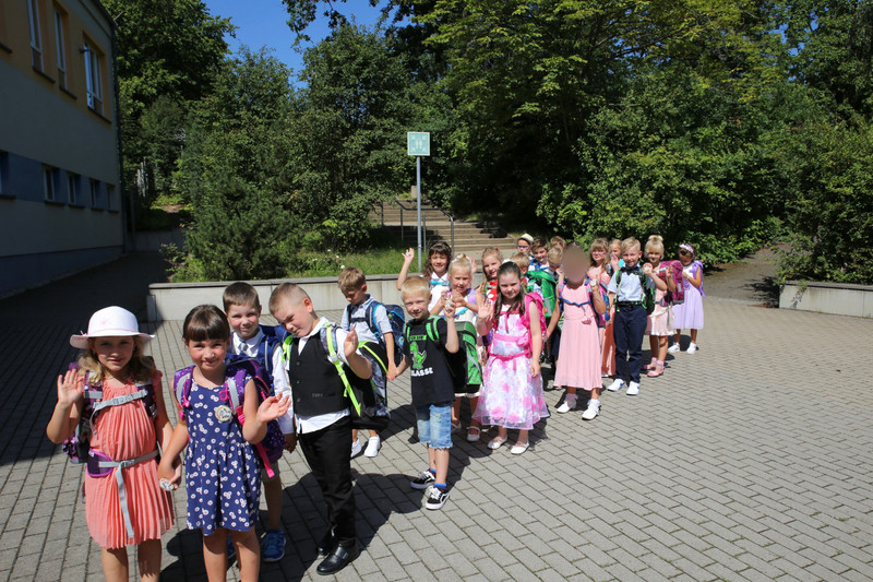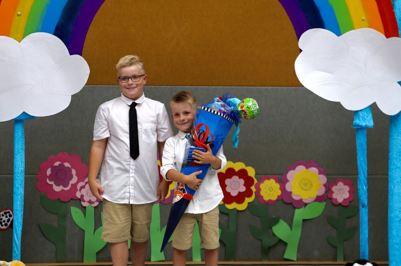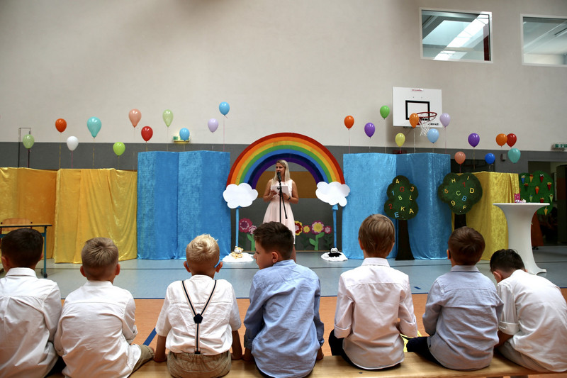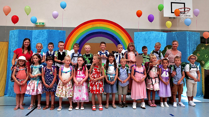 Aufgeregt und erwartungsvoll verfolgten die Kinder gemeinsam mit ihren Gästen zuerst das abwechslungsreiche Programm unserer Theaterkinder in der Heinrich-von-Kleist-Turnhalle. Dabei wurden die Neuen auch von den beiden Lesekatzen "Mimi und Mo" begrüßt. Nach der Aufführung durften die ABC-Schützen zum ersten Mal zusammen mit ihrer Klassenlehrerin und Horterzieherin ihr Klassenzimmer besuchen. Auf den Tischen lag schon alles für den Schulstart bereit - neue Arbeitshefte, Bücher, sogar Warnweste und Cap für einen sicheren Schulweg. Schnell fanden die Mädchen und Jungen ihren eigenen Platz und packten ihre Sachen ein. Mit dem gefüllten Ranzen auf dem Rücken ging es stolz wieder zurück in die Turnhalle. Denn dort warteten schon die Eltern, Großeltern und Geschwister mit 50 prallgefüllten und heißbegehrten Zuckertüten auf die Schulanfängerinnen und Schulanfänger. Nachdem alle noch schöne Fotos unter dem tollen Regenbogen gemacht haben, ging es für die Kinder zur Party nach Hause.