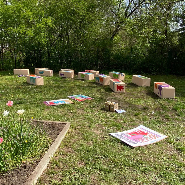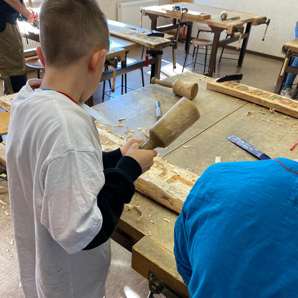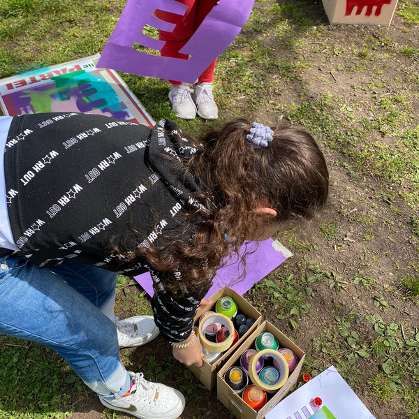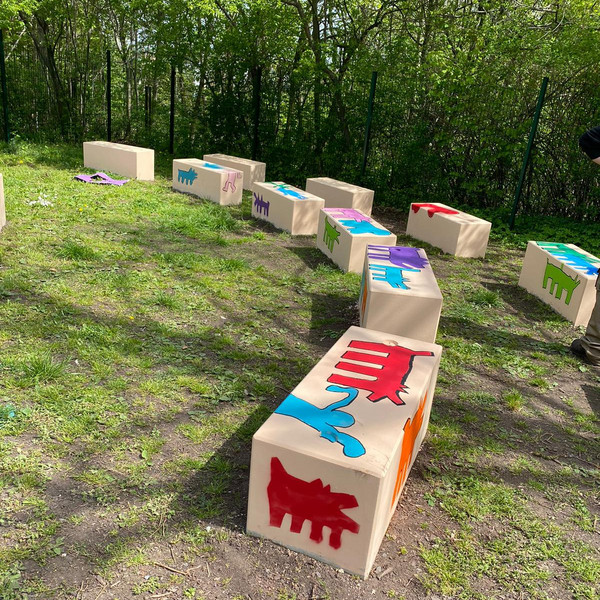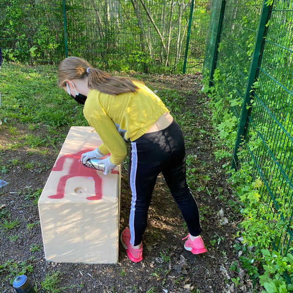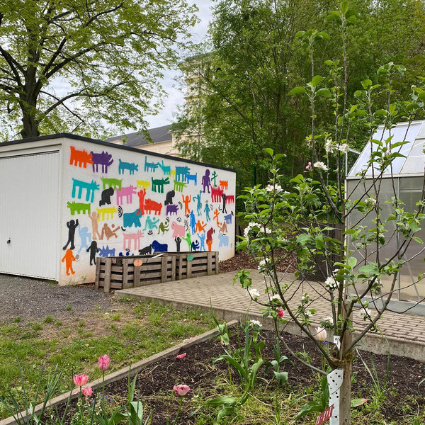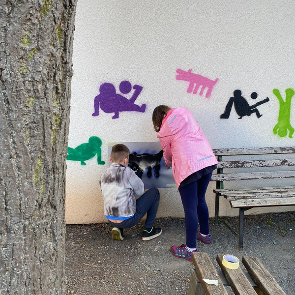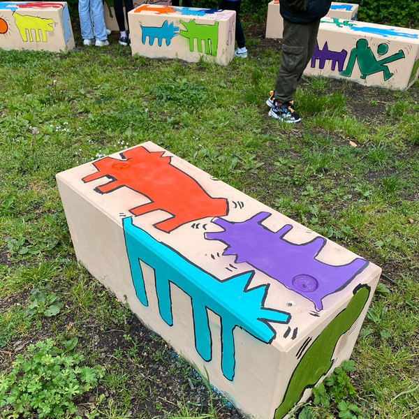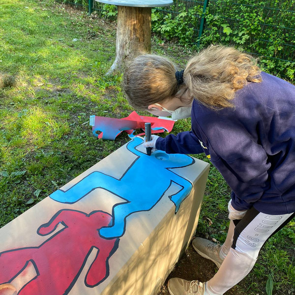 Anfang Mai fand für alle vierten Klassen ein besonderes Kunstprojekt statt. Alle Kinder durften an mehreren Tagen an verschiedenen Stationen arbeiten. Dabei wurden zum Beispiel Holzbretter für das grüne Klassenzimmer hergestellt. Sie wurden zunächst beschriftet, dann wurde rund um die Buchstaben das Holz ausgestemmt und abschließend die Buchstaben angemalt. Außerdem entwarf jedes Kind im Kunstzimmer eine individuelle Vorlage auf A4, angelehnt an den Künstler Keith Haring. Die Vorlage wurde auf A1 übertragen und das Innere des Bildes ausgeschnitten, sodass eine große Schablone entstand. Die Sitzblöcke im grünen Klassenzimmer wurden mit gelber Farbe grundiert. Anschließend konnte jedes Kind mithilfe der Schablone sein entworfenes Bild auf die Garage und die Sitzblöcke aufsprayen.