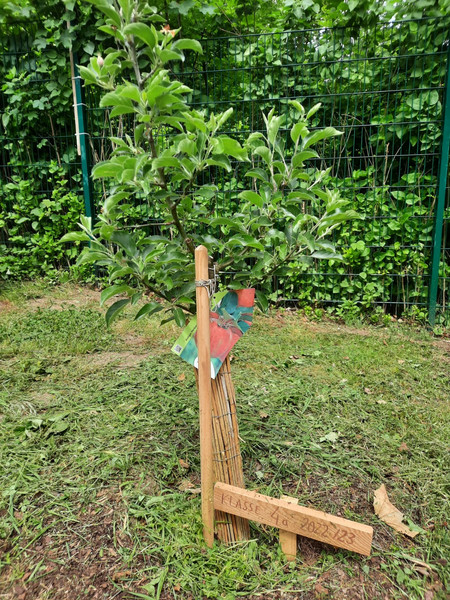 Gartenbaumschule „HOT“ hat uns die Apfelbäume gebracht und Toms Eltern haben diese ein wenig gepflegt. Jetzt stehen sie in unserem Schulgarten und werden gut gepflegt. Wir übertragen diese Verantwortung unserem Hausmeister Herr Fuhrmann und Frau Meyer, die sich abwechselnd mit den Klassen der KKGS darum kümmern.