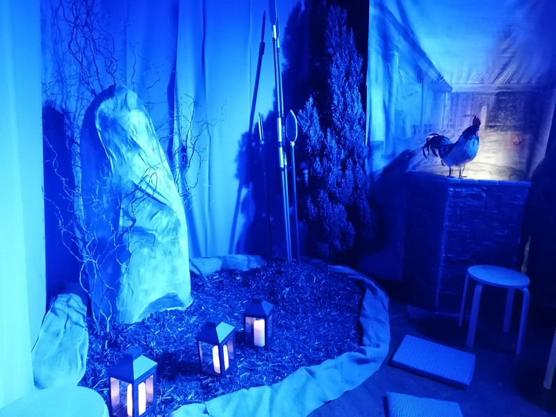 Nun kam das traurigste: der Karfreitag. An dem Kreuz waren viele Sorgen angebracht. Den Stein mit den eigenen Sorgen konnten wir zum Kreuz bringen und in einer Kiste ablegen. Durch einen dunklen Gang hindurch kamen wir in einen duftenden hellen Saal. Er war geschmückt mit unzähligen Blumentöpfen, Sträußen und anderen Pflanzen. Gemeinsam haben wir noch einen Freudentanz aufgeführt.