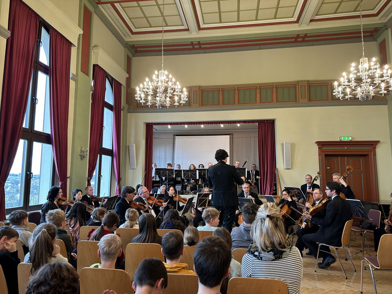 Endlich war es wieder so weit. Am 15.01. durften wir in unserer schönen Aula die Robert Schumann Philharmonie Zwickau-Plauen begrüßen. Herr Sandmann (der Erzähler) stellte die Mitglieder des Orchesters vor. Zum Glück hatten sich die Schülerinnen und Schüler der dritten und vierten Klassen auf dieses Erlebnis vorbereitet, so dass sie interessiert zuhörten. Endlich sahen und hörten alle die Instrumente im Original, denn bisher hatten die Meisten sie nur in Miniatur gesehen oder aus dem Lautsprecher gehört.