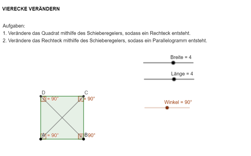 Beispiel 1: Aktivität zum selbständigen Üben, welche Zusammenhänge zwischen Vierecken veranschaulicht. Durch die eingebauten Schieberegler können die SchülerInnen selbständig die Zusammenhänge und Eigenschaften erkennen.