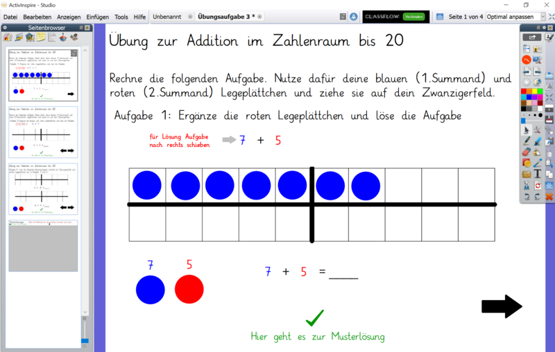 Dies ist ein Beispiel wie ActiveInspire zur Übung der Addition im Zahlenraum bis 20 genutzt werden kann. Dabei wird sich vorallem die Kopierfunktion einzelner Elemente zunutze gemacht, um an der Tafel Legeplättchen im Zwanzigerfeld zu simulieren (Kopie mit der Maus ziehen).
