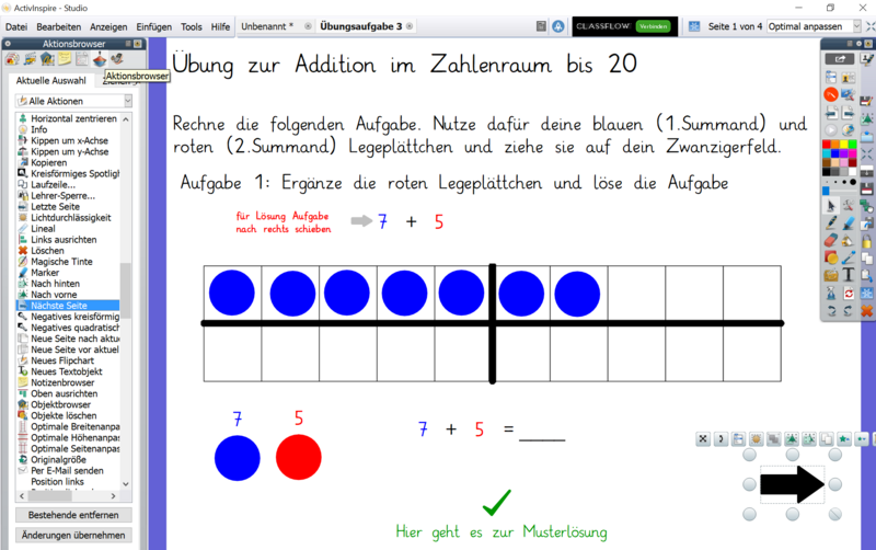 Der Aktionsbrowser ermöglicht die unterschiedlichsten Aktionen. Mit Klick auf das entsprechende Symbol kann beispielsweise die nächste Seite verlinkt werden (schwarzer Pfeil) oder es können ganz bestimmte später auftretende Tafelbilder (grünes Häkchen-Zur Musterlösung) so mit der aktuellen Seite verbunden werden. Dies ist vergleichbar mit den Verlinkungen bei einer interaktiven Selbstlernpräsentation.