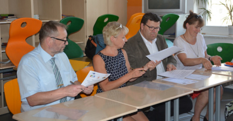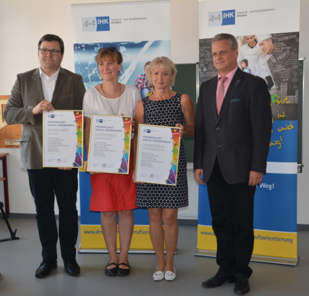 Frau Albrecht unterzeichnete für die Leonhard-Frank-Oberschule, Herr Müller für die Oberschule Kötitz und Frau Janik für die Evangelische Oberschule. Anwesend war der Oberbürgermeister Herr Neupold, der Wirtschaftsdezernent Herr Nasr sowie Frau Krüger als Schulreferentin und Herr Köhler von der IHK Dresden, der das Projekt "Partnerschaft-Schule-Unternehmen" würdigte.