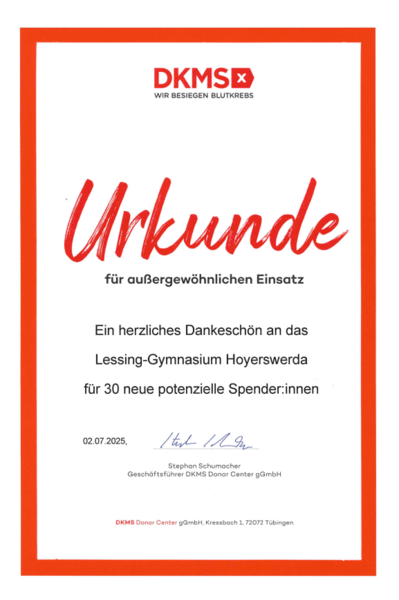 Wir haben in den Somerferien von der DKMS ein Schulsiegel für unsere engagierte Arbeit erhalten.