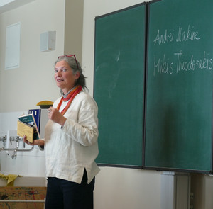 Nun schon zum vierten Mal besuchte die Dresdnerin Uta Hauthal unsere Schule. Auch diesmal berichtete sie von ihrem Leben, nicht nur als Schriftstellerin, sondern auch als Musikerin und „Betreiberin einer Poesie-Tankstelle“.