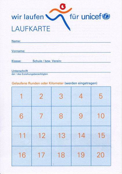 Am kommenden Montag (6.7.) beteiligt sich unsere Schule am UNICEF-Spendenlauf. Dabei laufen die Schüler vorgegebene Runden (ca. 300m) auf dem Sportplatz. Jede absolvierte Runde wird von einem vorher gewählten Spender mit einem selbst gewählten Betrag honoriert.