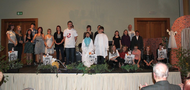 Gäste der diesjährigen Frühlingsgala staunten am vergangenen Freitag nicht schlecht, dass neben dem herbei gesehnten Frühling auch die Schulgeister erwachten. Die Verwunderung legte sich nicht, als der Moderator per Telefon mit dem Obergeist eine Wette einging. Diese beinhaltete, dass die zwei kleinen Schulgespenster eine gelungene Gala hervorzaubern ODER der Unterricht von nun an nachts stattfinden sollte! Um dies zu verhindern, strengten sich alle Teilnehmer, egal ob große oder kleine Künstler, besonders an. Instrumente, wie Querflöte, Gitarre, Klavier und Trompete erklangen. Es wurde gesungen, getanzt, geturnt und rezitiert. Unsere Schulband bot alte und neue Lieder aus ihrem Repertoire dar. Die GTA-Einrad-Gruppe zeigte in der Turnhalle ihr Können mit Bällen und Reifen. Und nicht zu vergessen wurde das Publikum wie von Geisterhand durch gekonnt geschwungene Lichtkugeln verzaubert. Am Ende waren sich alle einig. Gala gelungen. Wette gewonnen. Erleichterung und Freude in vielen Gesichtern.