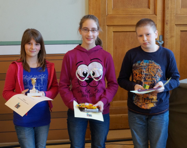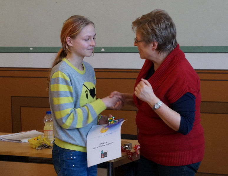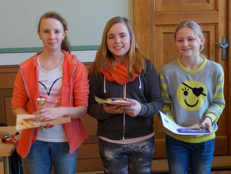 Leider konnten die ältesten Superhirne aus den 10. Klassen wegen der laufenden Probe-Prüfungen nicht antreten, aber natürlich wollten die Neuen aus den 3 fünften Klassen aufs Siegerpodest. Das klappt jedoch nur sehr selten gegen die Älteren aus den 6. Klassen, diesmal aber konnte Emily Grett aus der 5b dieses Kunststück fertig bringen und sich den 3. Platz holen, knapp hinter Siegerin Lisa Agsten aus der 6d und der Zweitplatzierten Verena Kunze aus der 6c.