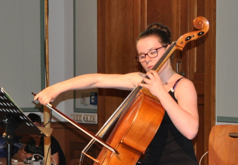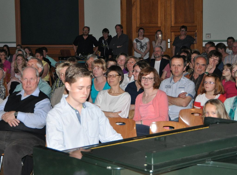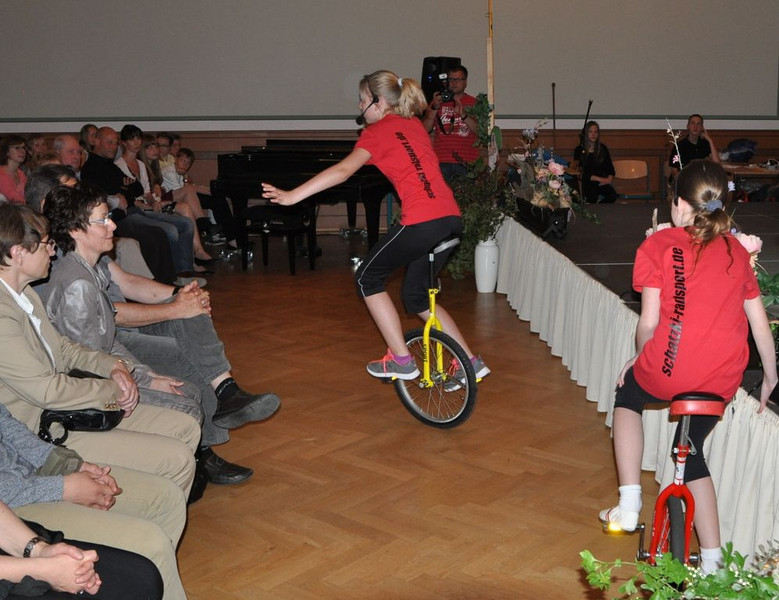 Und während hinter den Kulissen beraten wurde, wo man die Kleinwüchsigen fortan unterbringen könnte, zeigten auf der Bühne die Talente der Härtwig-Schule, was sie drauf haben. Ein bunter Strauß von Darbietungen erfreute für fast 2 Stunden die zahlreich erschienenen Gäste - Eltern und Schüler, Vertreter der Stadt Oschatz und Ehemalige genauso wie einfach nur neugierige Oschatzer. Sie bereuten ihr Kommen sicher nicht, denn es gab alles, was Schüler so auf eine Bühne bringen können – einen Sketch mit den famosen "Härtwigs Plaudertaschen" aus der 5. Klasse, Gedichte und Tanz, sportliches Können der Einrad-Gruppe und natürlich viel Musik – Gitarren und ein Cello, virtuoses Klavierspiel des scheidenden Zehntklässlers Theo Wünsche und natürlich die neuesten Werke der Schulband, die mal wieder den Umbruch geschafft hat und sich nach zahlreichen Abgängen in neuer Frische präsentierte.