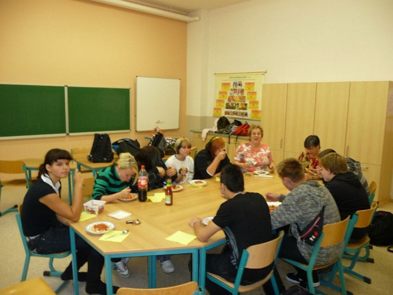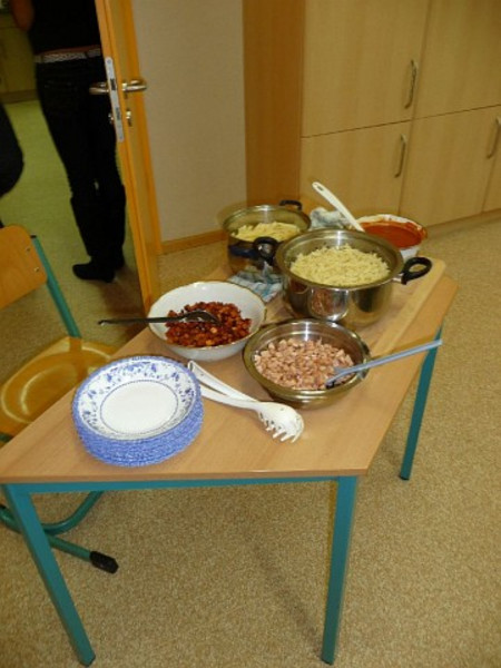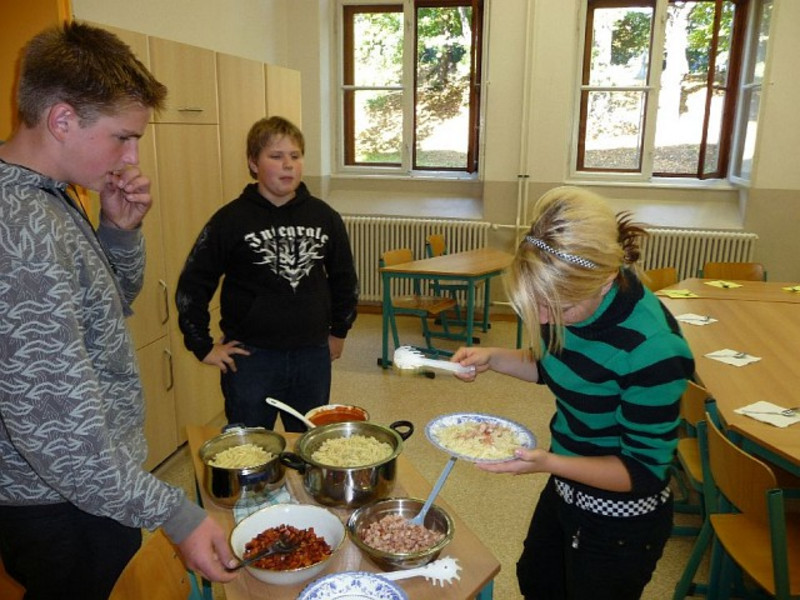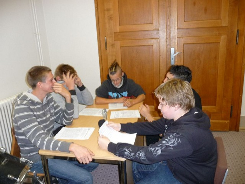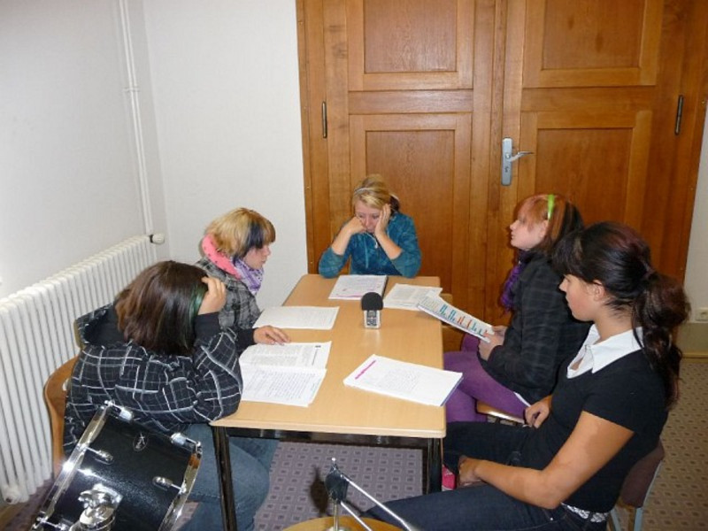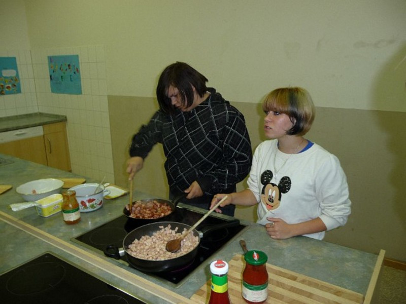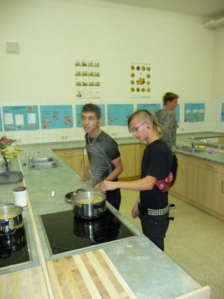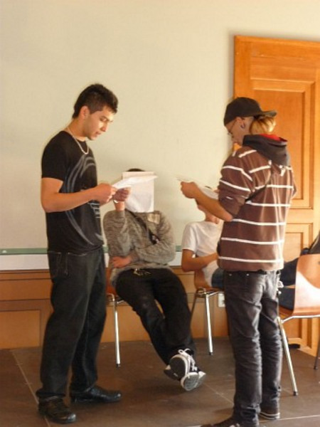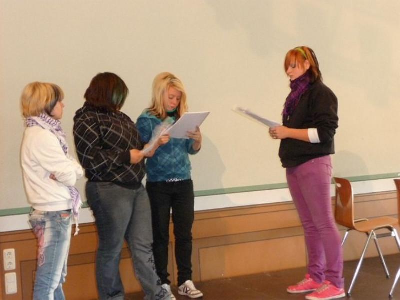 Am zweiten Tag folgten nach einem gemeinsamen Frühstück weitere Sprechproben sowie das szenische Spiel der Hörszenen auf der Aula-Bühne, bevor später im Internet nach brauchbaren Geräusche-Downloads gesucht wurde und schließlich der Vormittag mit gemeinsamem Kochen ausklang.