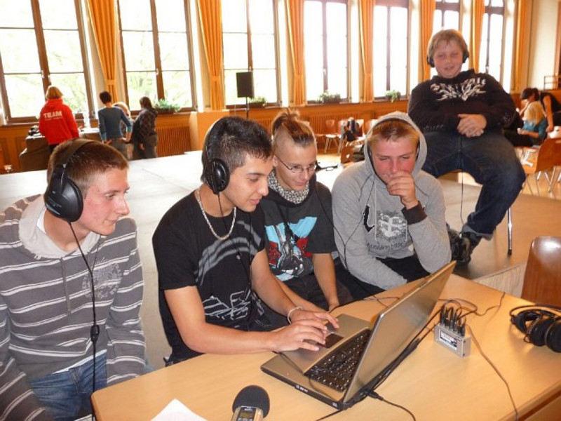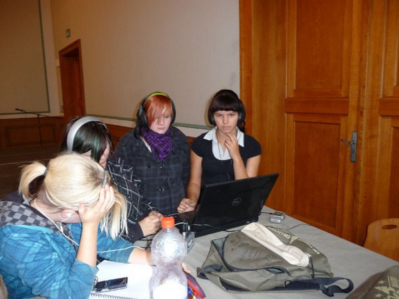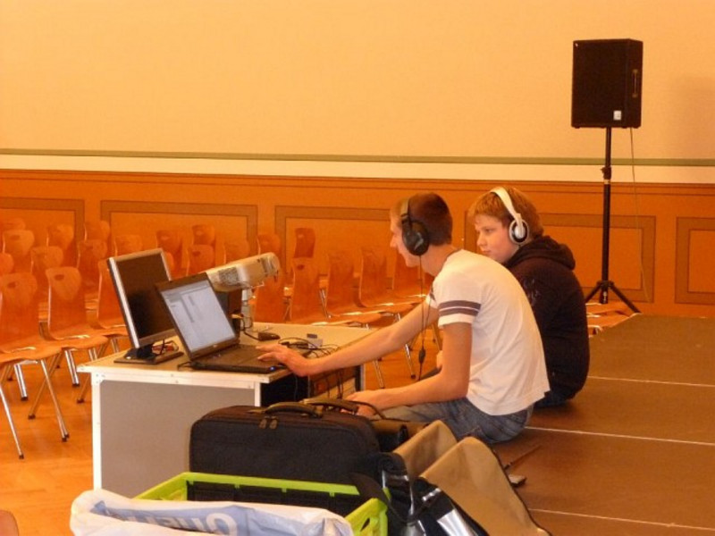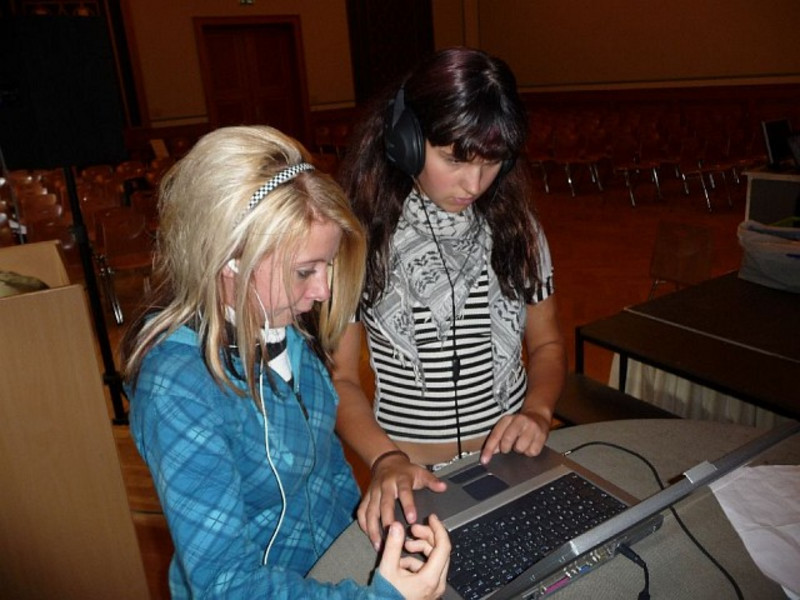 Tag drei brachte dann erneute Aufnahmen der Sprechtexte sowie von Geräuschen. Schließlich saßen oder standen alle wieder vor den Laptops und versuchten sich per Software am Zusammenschneiden von Texten und Geräuschen zum fertigen Hörspiel, was für die Meisten gar nicht so einfach war ...