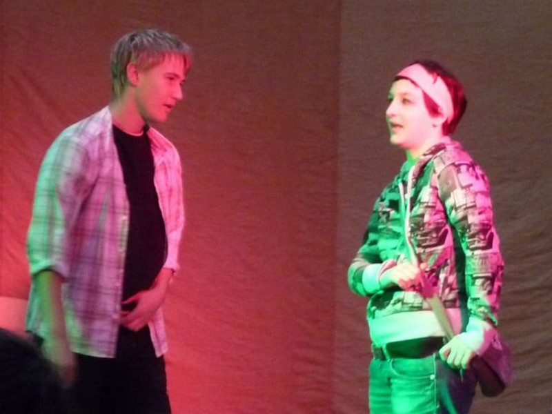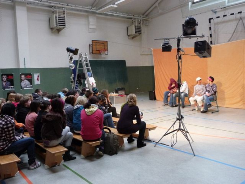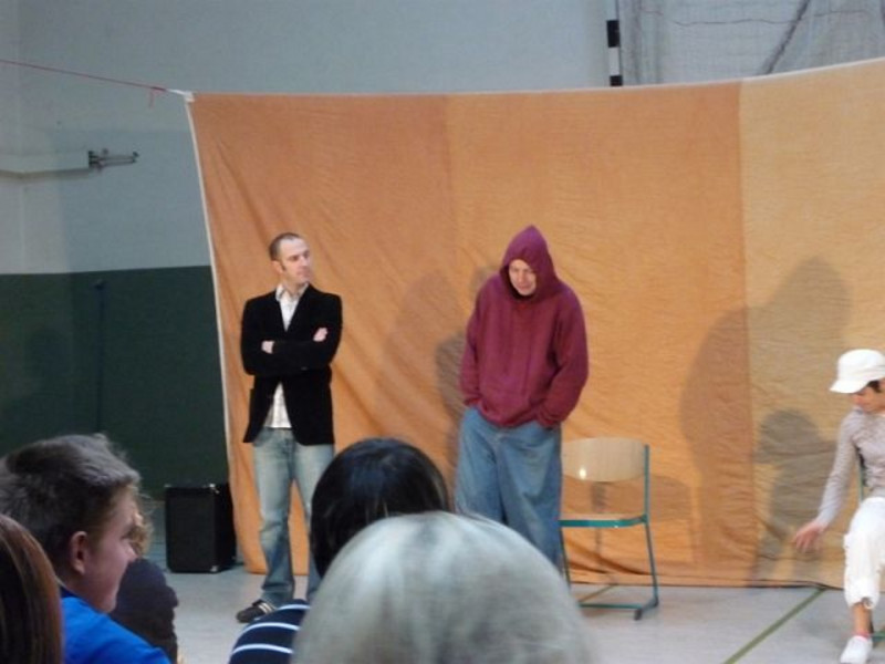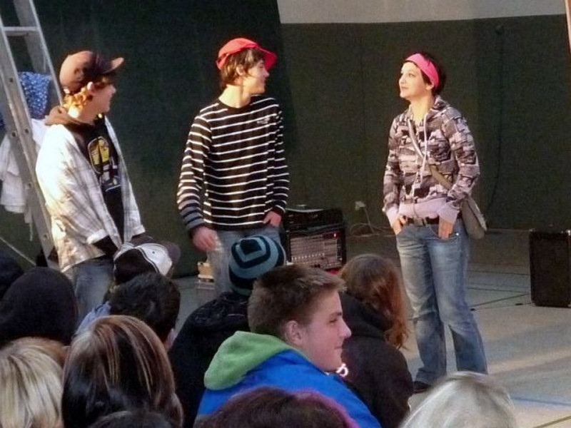 Nachdem Schüler der 8. bis 10. Klassenstufe das vom Gesundheitsamt angebotene Stück „Aids geht’s los“ gesehen hatten, begann, sehr zum Unbehagen der meisten Zuschauer, die Mitmach-Phase! Alles begann von vorn und jeder Zuschauer hatte die Chance, per Stopp-Ruf zu unterbrechen und sich einen anderen Fortgang der gespielten Handlung zu wünschen – im Idealfall sogar selbst in die Rolle einer Figur zu schlüpfen und mitzuspielen. Das trauten sich dann aber doch nur ganz wenige, Sebastian Vetter aus der 8a zum Beispiel oder Kelly Ann Woogk, Dominik Scholz und Jessica Grätz aus der 9b, um nur einige zu nennen – Glückwunsch zu so viel Mut!