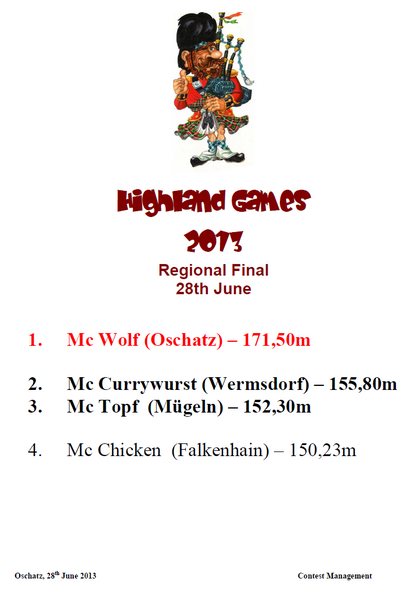 Bei ganz und gar keinem schottischen Wetter, die Sonne lachte nach Kräften über den Wettkämpfern, trafen sich die Sieger-Clans der Vorwettkämpfe aller 7. Klassen an den Mittelschulen in Wermsdorf, Mügeln Oschatz und Falkenhain am 28. Juni zum zweiten Regional-Finale an der Härtwig-Schule in Oschatz. Wie immer konnte es am Ende nur einen geben – einen Sieger nach Tauziehen, Baumstammweitwurf, Steinwurf, Gummistiefelweitwurf, Strohsackwerfen und dem "Farmer’s Walk", einem Staffelwettlauf mit zwei schweren Eimern.