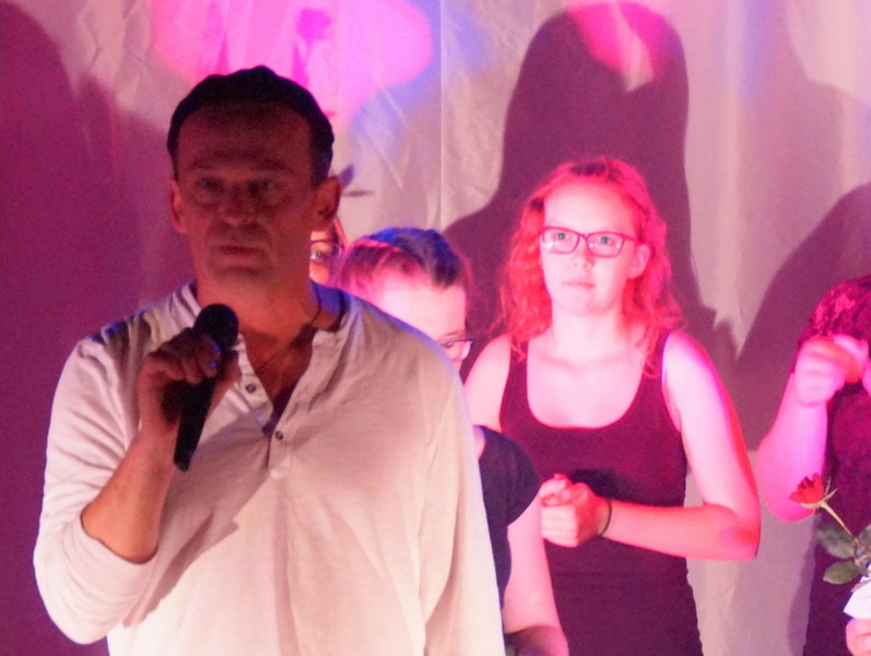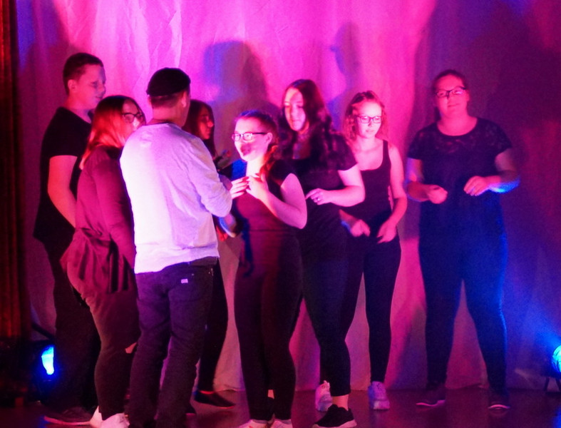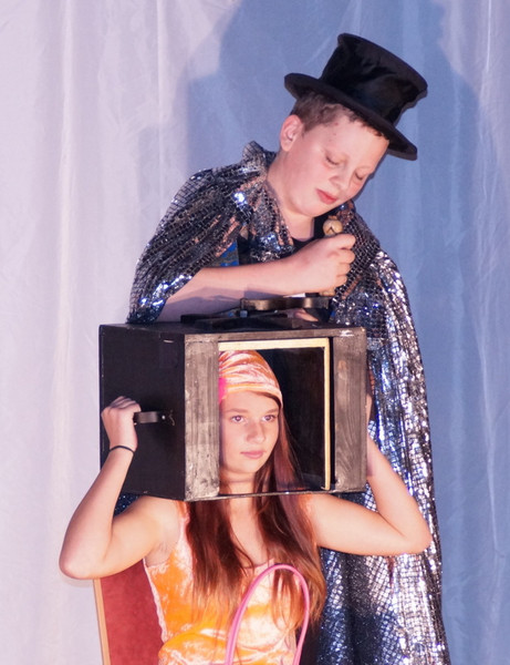 Während Mary (unsere Trainerin) mit ein paar Schülern die 5. Szene einstudierte, übte Herr Bastel mit Jonas Richter und mir (Janett Kay) das Zaubern. Als seine Assistentin Jaqueline hatte ich dem Zauberer immer seine Utensilien überreicht. Er hat mir sogar den Kopf verdreht, mich weggezaubert und mir operativ eine Gummihüfte verpasst. Nachdem wir alle fertig waren, hatten wir die nächste Szene einstudiert. Danach war die Arbeit für diesen Tag geschafft.