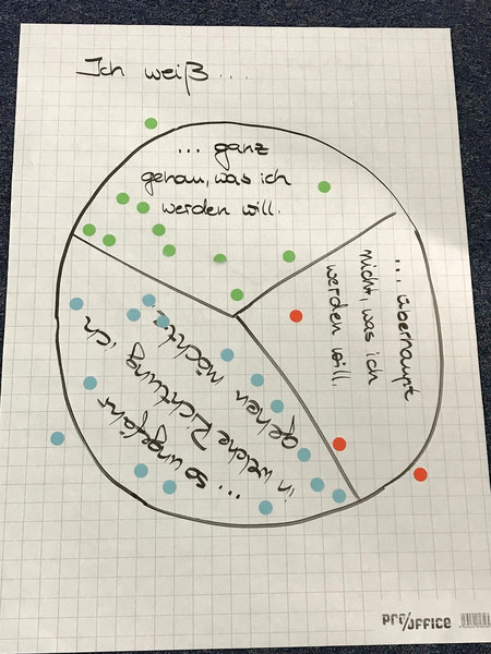Da waren viele realistische Vorstellungen, aber auch ein paar Traumschlösser, die eventuell eingestürzt sind angesichts der harten Fakten in den Steckbriefen zu den verschiedenen Berufsbildern, die sich der eine oder die andere auch zum Mitnehmen ausgedruckte. Und bei einigen hat es wohl auch durchaus Eindruck hinterlassen, welche schulischen Anforderungen für manchen Beruf zu erfüllen sind, welches konkrete Schulfach wichtig sein könnte! Da haben einige gemerkt, dass es noch eine Menge Arbeit gibt ...
