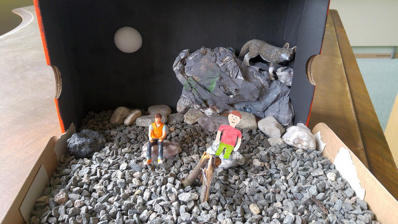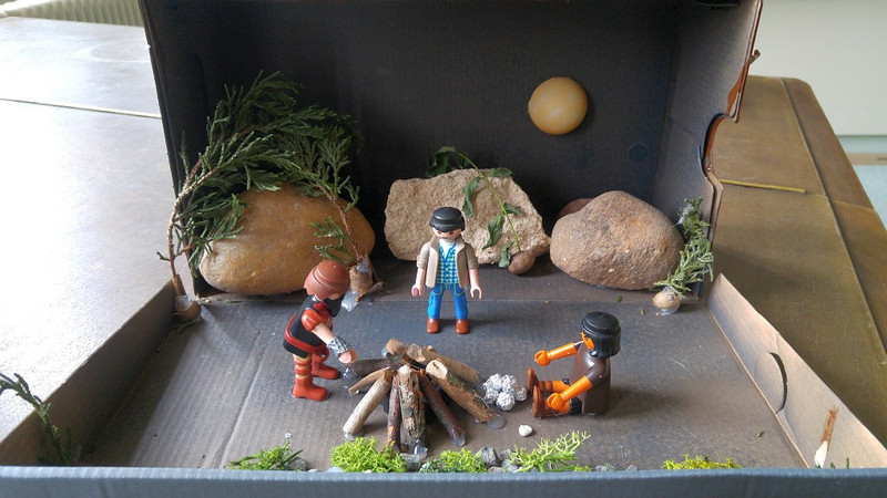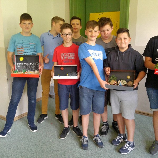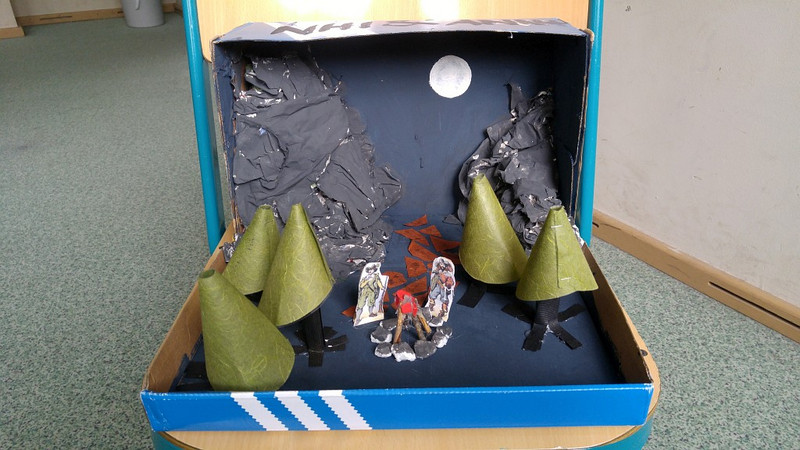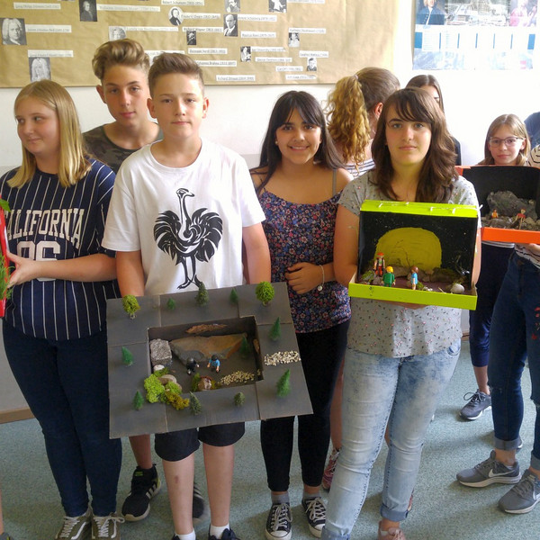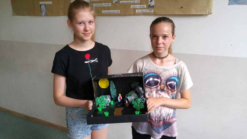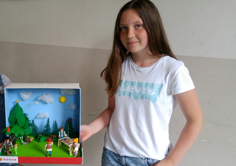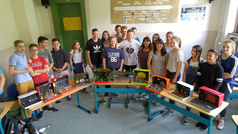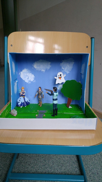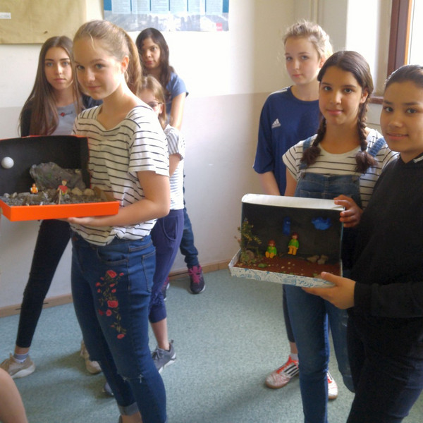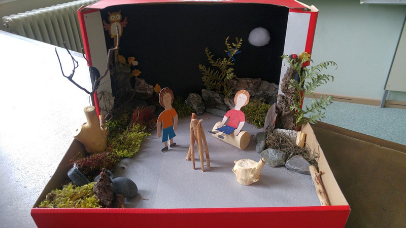 Zum Abschluss des Themas gestalteten alle in kleinen Gruppen Bühnenbilder im Schuhkarton. Hierbei waren Kreativität, handwerkliches Geschick und Teamwork gefragt. Nach zwei Unterrichtsstunden in freier Arbeit entstanden viele tolle Objekte, die deren Bildner stolz vor ihren Klassen präsentierten.