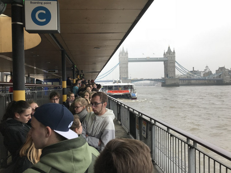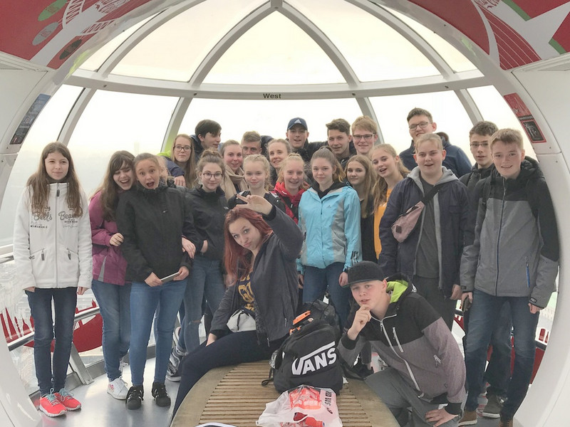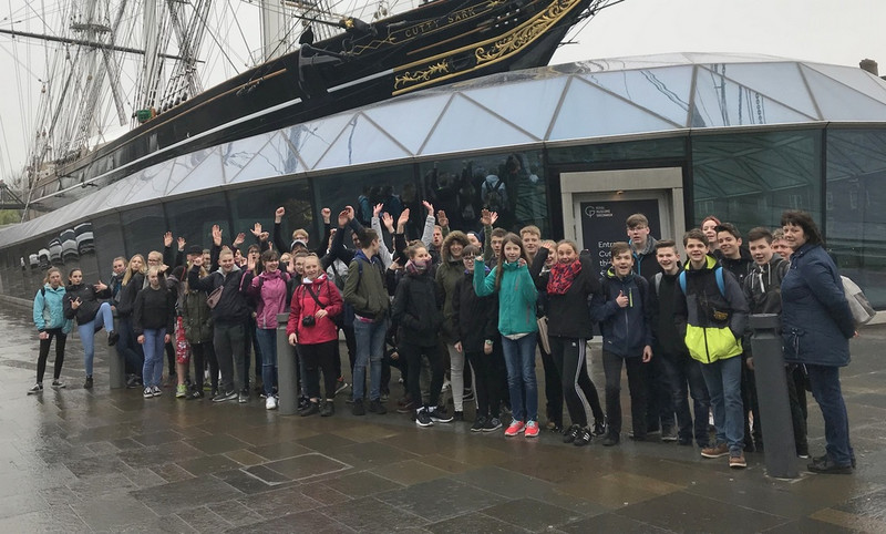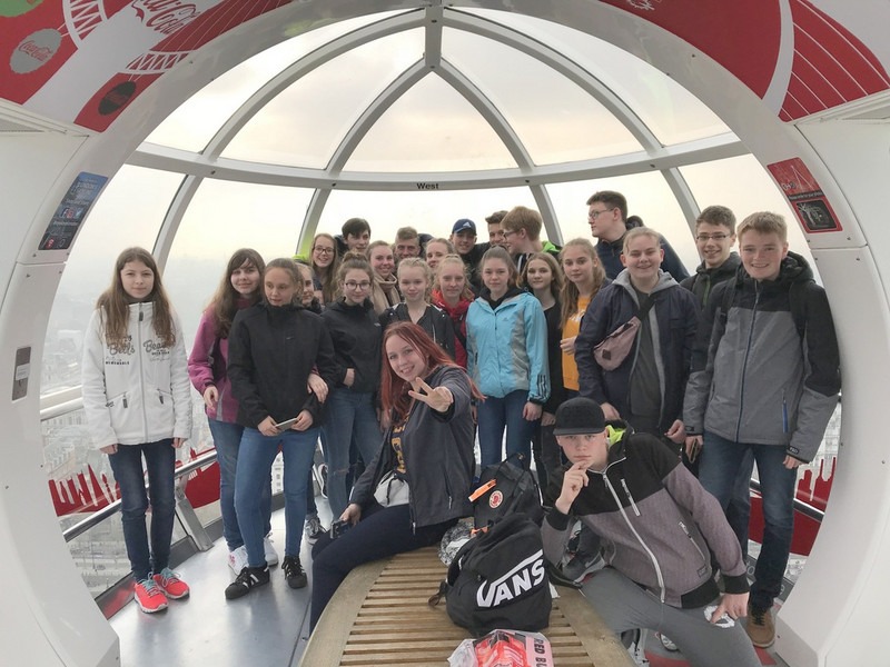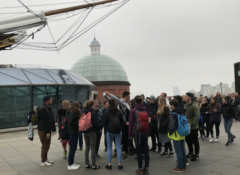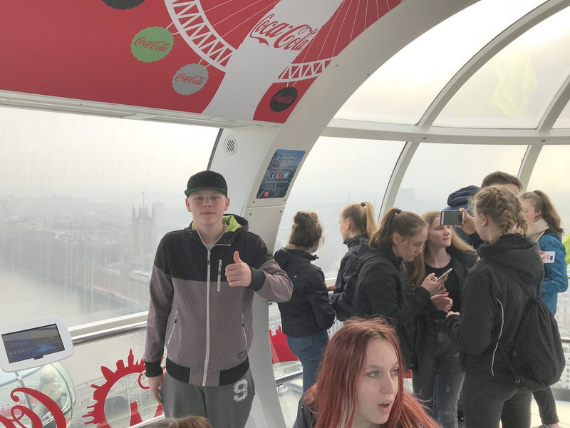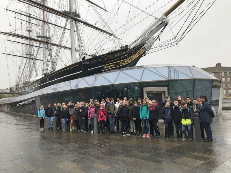 Es war Donnerstag geworden und das hieß Abschied von den Gasteltern, denn über London würde es wieder zurück nach Deutschland gehen! Die Hauptstadt empfing uns wie schon am Dienstag‚ very British‘, die Jacken wurden hoch geschlossen, die Schirme aber zum Glück nicht gebraucht. Angekommen im Stadtteil Greenwich begutachteten wir den Nullmeridian am königlichen Observatorium und begaben uns dann auf den weh hinunter zur Themse, um uns am alten Tee-Segler Cutty Sark in eine Freizeit zu verabschieden. Nach dieser schipperte die Reisegruppe zum Tower of London, um die dortige Tower Bridge zu besichtigen. Der im wahrsten Sinne des Wortes mit weit über 300 Metern eigentliche Höhepunkt des letzten Tages lag in den tief hängenden Wolken und leider blieb er auch dort, als wir mit den 2 superschnellen Liften bis auf gut 220 Meter über London gerast waren, um ‚The View‘ zu genießen – nur die schärfsten Adleraugen unter uns hatten tatsächlich einen Ausblick auf die Stadt… Pech für uns, aber wir drücken unseren Nachfolgern die Daumen, dass es ihnen vielleicht besser ergeht im nächsten Schuljahr!
