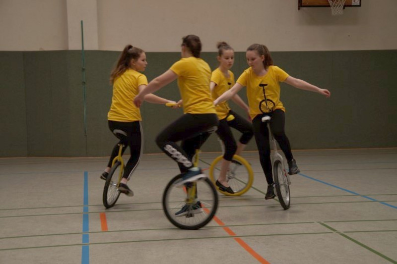 Am 20.03.2018 fand in der Aula der Robert-Härtwig-Schule das Fest der jungen Talente statt. Nach einer kurzen Begrüßung durch Frau Fingas begann der erste Teil der Talentsuche in der Turnhalle der Schule. Schülerinnen der GTA-Gruppe zeigten ihr Können im Einradfahren, wofür sie großen Applaus erhielten. Anschließend boten die sportlichen Mädchen aus den Klassen 7b und 7d einen beeindruckenden Akrobatikauftritt.