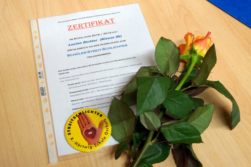 Seit 2008 werden an unserer Schule Schülerstreitschlichter ausgebildet, die euch bei kleineren und größeren Streitigkeiten zur Seite stehen sollen. Es sind Schüler der 8. bis 10. Klassen, denen der Schulfrieden am Herzen liegt und die Freude am Arbeiten mit jüngeren Schülern haben. Sie kennen sich gut aus mit Zank, mit Kummer und mit den Problemen, die Kinder in den unteren Klassen miteinander haben und sie haben in einer intensiven viertägigen Ausbildung gelernt, wie gute Lösungen für Konflikte gefunden werden können, ohne dass jemand bestraft wird oder am Ende als Verlierer dasteht.