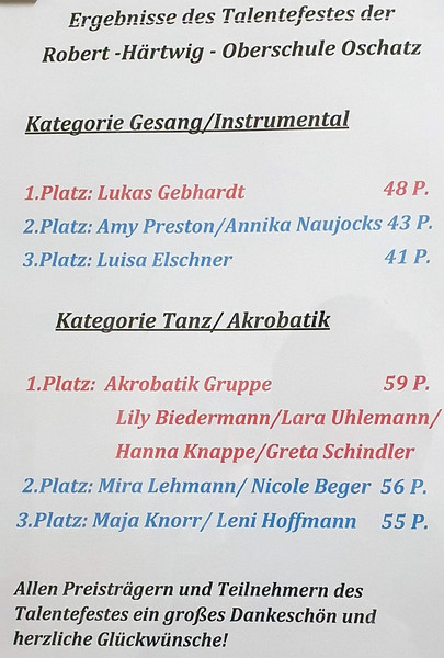 Herzlichen Glückwunsch allen Siegern und ein großes Lob an alle Teilnehmer für ihren Mut und den Fleiß, der in der Vorbereitung jedes einzelnen Beitrages steckte.