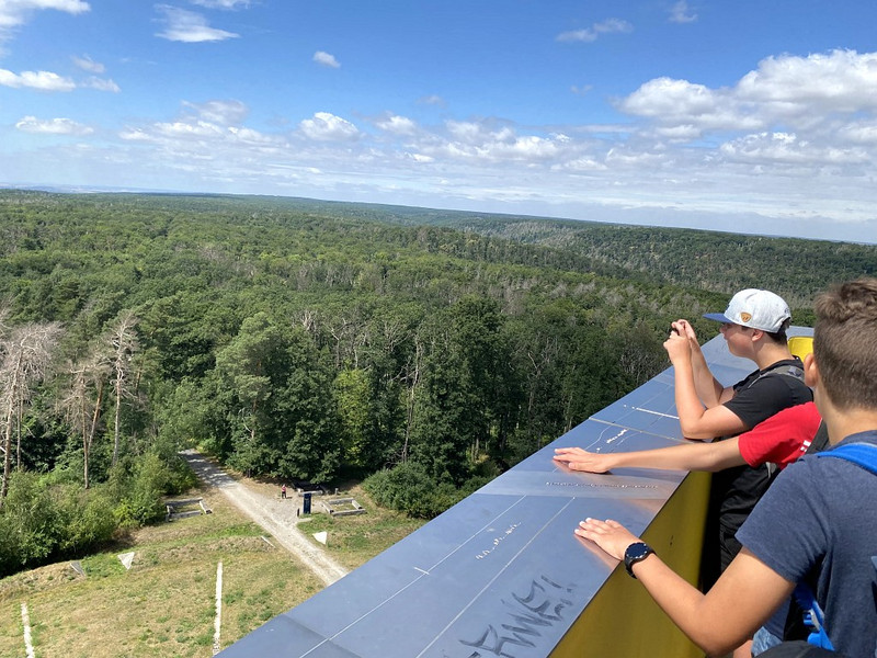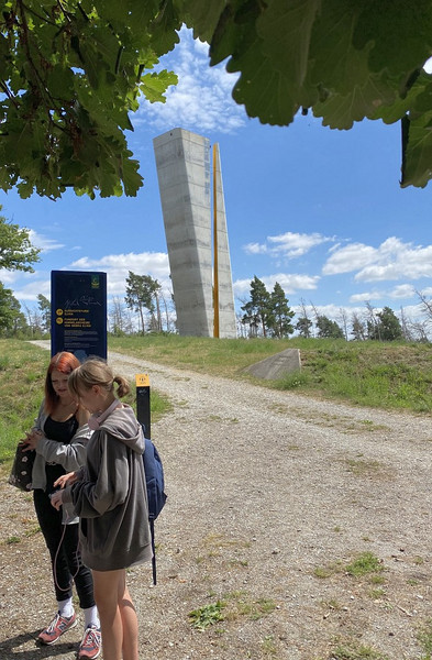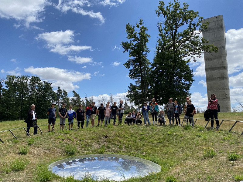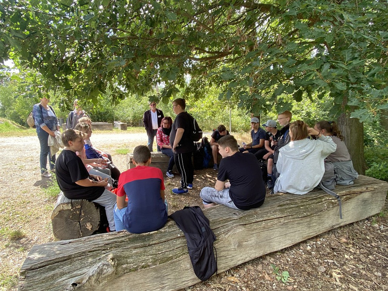Am Mittag wanderte die Reisegruppe dann nach einem kurzen Imbiss aus dem Rucksack von der Arche zur Fundstelle, um dort den Ort in Augenschein zu nehmen, an dem zwei mitteldeutsche Schatzgräber am 4. Juli 1999 mitten im Wald die nur 30cm tief vergrabene Himmelsscheibe sowie weitere wertvolle Schätze wie zum Beispiel zwei Schwerter ausgruben. Wie die 7d schon aus Frau Seydewitz‘ Geschichtsunterricht wusste, versuchten die beiden illegalerweise, ihren Fund zu Bargeld zu machen, statt ihn wie üblich zu melden und abzugeben – ihr Finderlohn wäre deutlich höher gewesen als der erzielte Verkaufserlös!