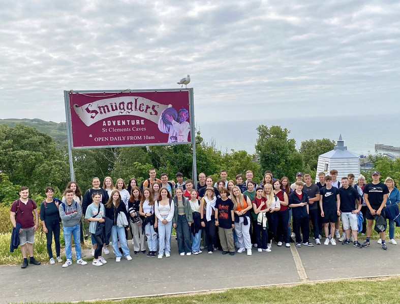 Endlich konnte nach einer Corona-Unterbrechung die langjährige Tradition fortgesetzt werden und so fuhren nach 2019 erstmals wieder interessierte Schüler mit auf die Insel, um Land und Leute kennenzulernen und natürlich ihr Schulenglisch auszuprobieren! Auch wenn man bei einigen Teilnehmern eher den Eindruck gewinnen konnte, sie wären ohnehin mehr mit ihrem Handy beschäftigt oder damit, wieviel Freizeit man am Abend noch haben könnte, so waren die allermeisten doch begeistert bei der Sache, wenn es auf Stadtrundgang in Hastings oder in die dortigen Schmugglerhöhlen ging oder der Küstenort Brighton erkundet wurde. Und natürlich gab es da noch an den 2 London-Ausflugstagen die vielen aus dem Unterricht so gut bekannten Plätze in der britischen Hauptstadt London in Augenschein zu nehmen! Angefangen beim Wachsfigurenkabinett Madame Tussauds über Big Ben und das London Eye bis hin zur Tower Bridge und dem Tower of London, dem Wolkenkratzer ‚The Shard‘, dem alten Teesegler Cutty Sark in Greenwich oder der O2-Arena nebst Seilbahn über die Themse.