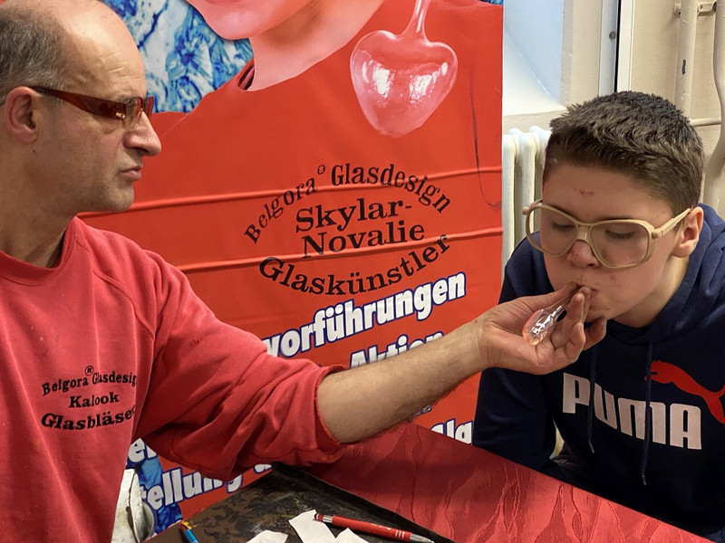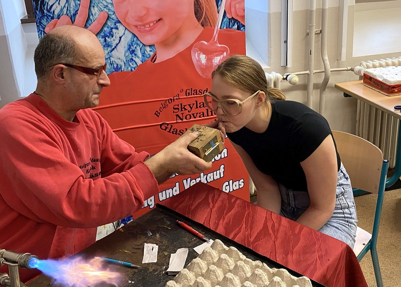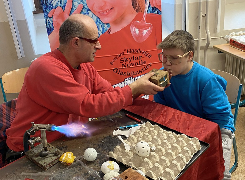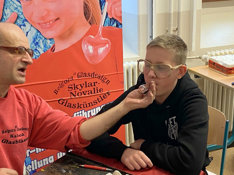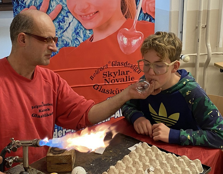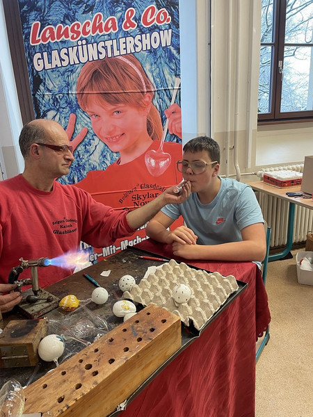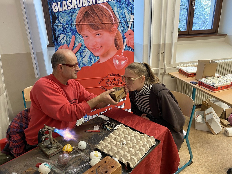 Und was für ein Spaß das war, fasziniert wurde bemalt oder den Glasbläser-Gehilfen bei ihrem Tun am Brenner zugeschaut. Schaut euch gern an, was für tolle Produkte dabei entstanden und sprecht mit euren Klassenleitern, wenn auch ihr gern mal ein Glasbläser-Gehilfe sein wollt! Frau Oehler oder Herr Richter vermitteln gern, wenn ein Termin gewünscht wird - im neuen Jahr soll es noch Lücken geben im Auftragsbuch des Künstlers!