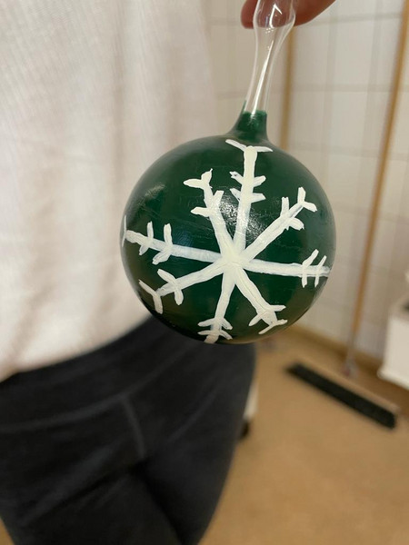 Nach der Theorie aber folgte natürlich die Praxis, denn alle Teilnehmer durften eine Christbaum-Kugel eigenhändig bemalen und ein gläsernes Kunstwerk mit Hilfe des großen Meisters selbst herstellen – noch eine solche Kugel oder ein Herz, eine Katze, einen Bären oder Frosch – je nach Geschick und Bemalung. Gern auch einen Wasserspender für den Blumentopfen in den genannten Versionen.