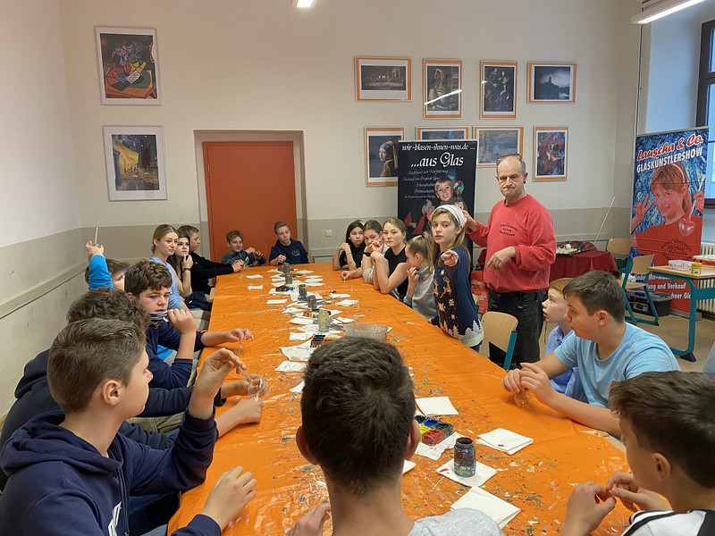 Die ‚Lauscha & Co.- Glaskünstlershow‘ war in der Stadt und machte am 2. Dezember im Kunstzimmer unserer Härtwig-Schule Station. Schüler der Klassen 7a sowie 8d ließen sich zunächst von Kalook Wollny in die Geheimnisse der Glasherstellung einweihen, kaum einer wusste, dass man Sand zu dessen Herstellung benötigt! Und leider auch jede Menge Energie – nicht so gut in diesen Energie-Krisenzeiten!
